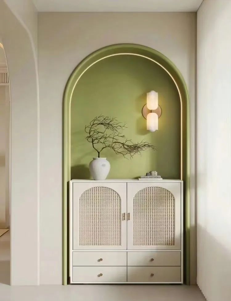 玄关区域,牛油果绿+奶油白的简单素净,将归家的仪式感直接拉满,收纳柜加中部留空,方便放置小物件,让家显得更整洁。