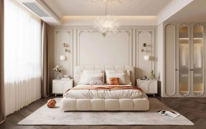 卧室以暖白色为主色调,搭配着原木气息的鱼骨拼木纹砖,散发着纯净温馨的气息,床品以白色和奶咖色来凸显品质感,背景墙的线条装饰提升空间的艺术感。
