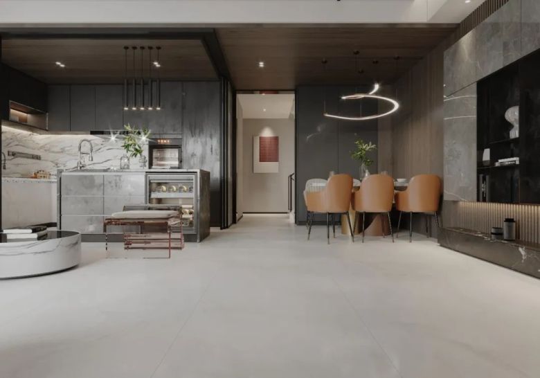 开放式规划合理的功能区,并利用高级雪白纹理与灰白色岩石底纹相互交融搭配活力又热情的橙色餐桌,彰显出餐厅一体空间张扬且时髦的魅力。
