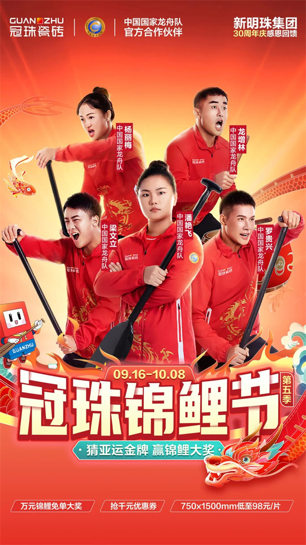 中国国家龙舟队在赛事以“5金1银”的佳绩圆满收官,冠珠瓷砖向广大消费者倾城献礼“冠珠锦鲤节第五季”也步入高潮!