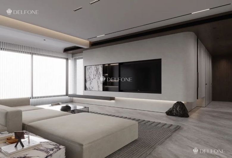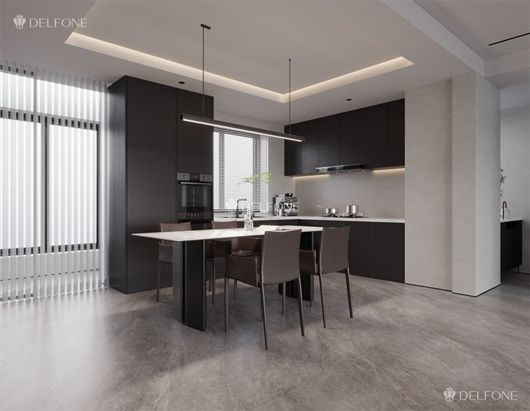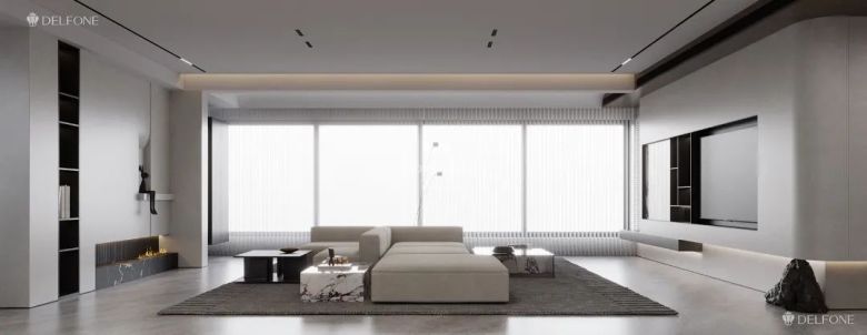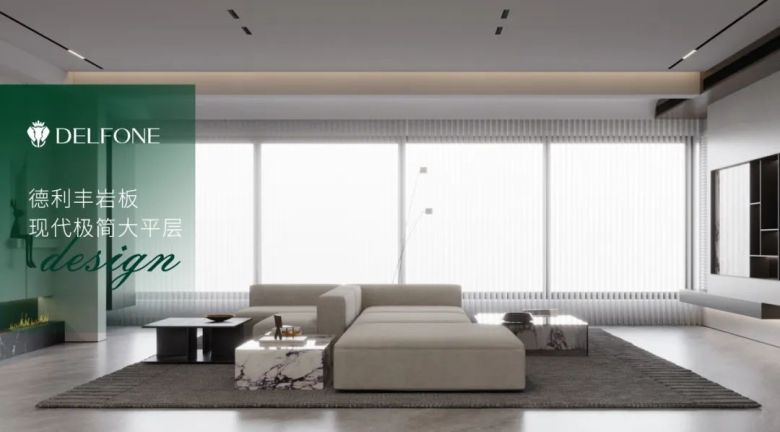 本案是163㎡现代极简大平层,选用2023年德利丰MINI系列新品【维多利亚灰】、【幻影灰】、【巴洛克米灰】等岩板作为主材,整体以黑白灰为基调,纯净而克制的色调赋予了空间刚柔并济的双重魅力。