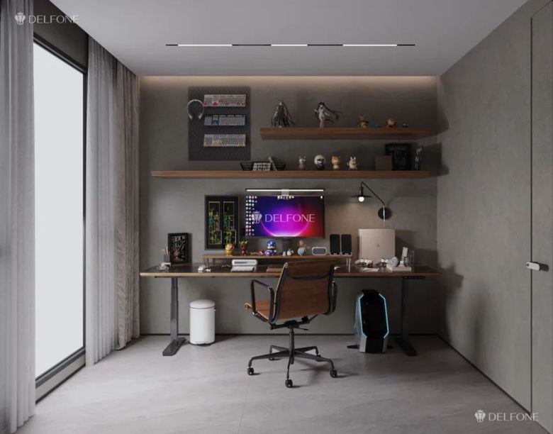 配置独立电竞房,电脑桌上方收纳柜阵列手办和模型,专属定制兴趣空间,尽情享受生活的乐趣。