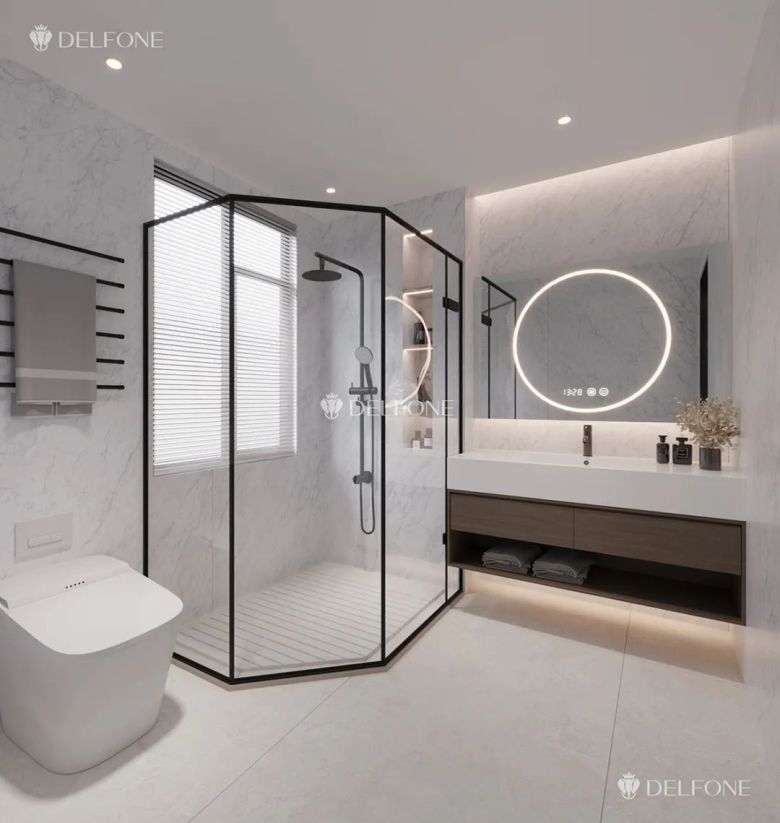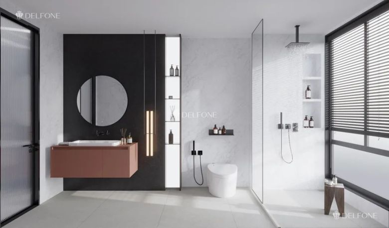 公卫、主卫均设计干湿三分离,使用方便。【巴洛克米灰】通铺地面,天鹅绒工艺自带高贵优雅气质;墙面选用【意大利细花白】砖面洁白纯净,两款产品相互映衬,让卫浴间于简净清爽中焕发高级意蕴。