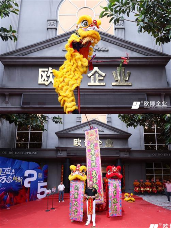 锣鼓铿锵,瑞气升腾,传统醒狮点睛仪式在众人的期待中盛大举行。欧博企业创始人梁永前、创始人夫人罗婵娟、董事长梁志澎及华陶企业董事长冯日广共同执起朱砂笔,为祥狮赋予灵气。“一点左眼财源广,二点右眼贵人助,三点额头吉星照,四点狮嘴纳千祥!” 随着笔尖落下,祥狮骤然“苏醒”,昂首腾跃,以矫健身姿舞动祥瑞,为欧博企业献上“财源广进、贵人相助”的美好祝福。随后的醒狮采地青、采天青环节中,欧博企业创始人梁永前与欧博企业董事长梁志澎分别接过象征“地赐良机”“天赐祥瑞”的青枝,寓意企业根基稳固、前景璀璨,现场掌声雷动,喜庆氛围推向高潮。