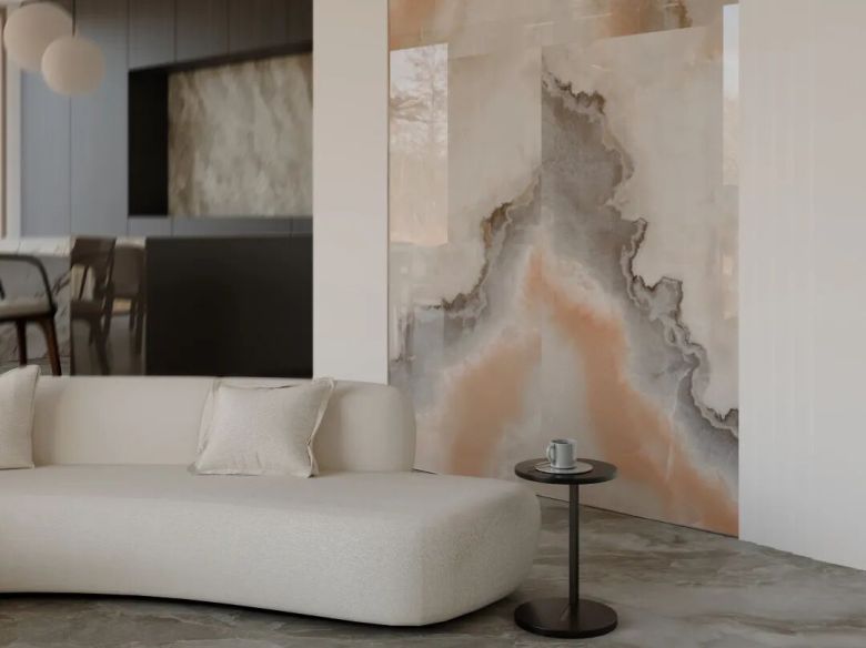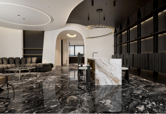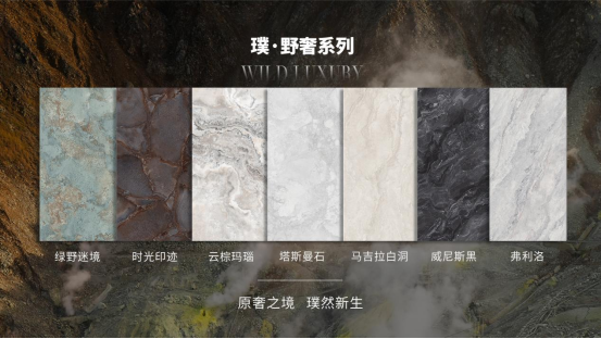 ▼「炫·星岩」系列 采用星耀晶闪干粒的技术,与脉络实现晶闪精准布局延伸,跟随肌理精准对位,由内而外,层层定位,纹路间闪现着流动光泽与质感,高度还原顶级奢石晶体部分的璀璨晶闪和莹亮色泽。