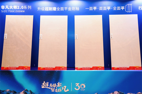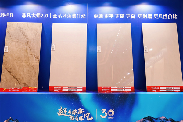 作为卓马集团的核心产品,非凡大师2.0系列在透感、镜面效果和耐磨性上全面升级。其耐磨性达到行业顶尖的6000转,远超普通釉面产品的1500转和第一代超耐磨产品的2100转。广告语“一面平,面面平,全面平”精准传递了产品的超平特性,深受消费者青睐。