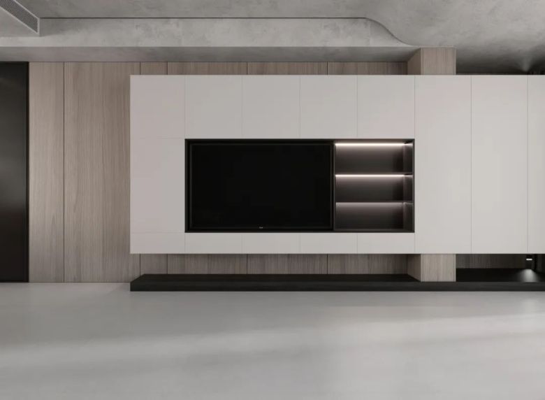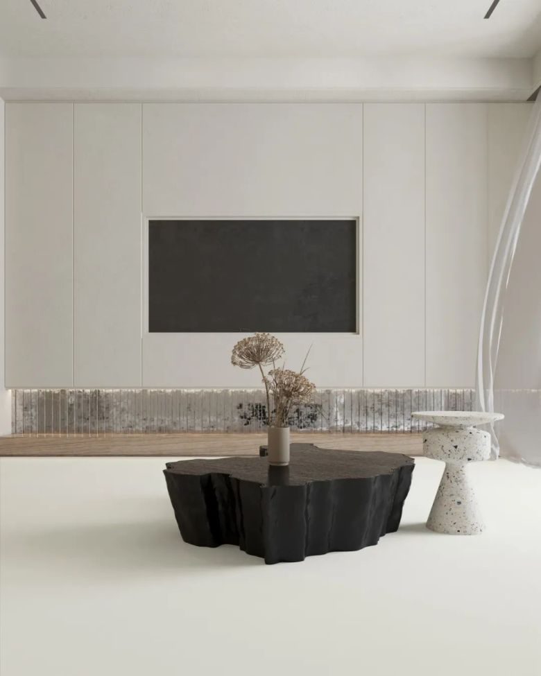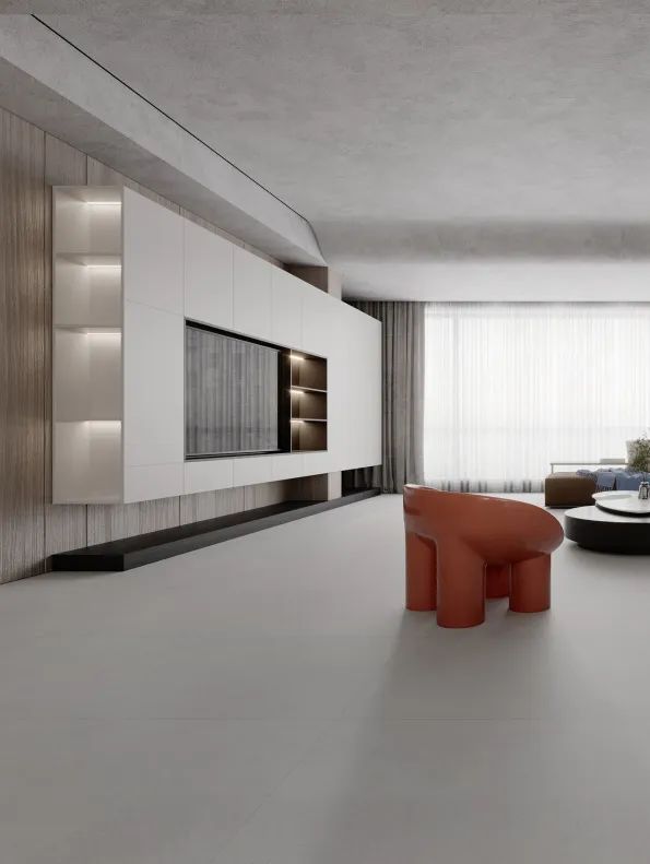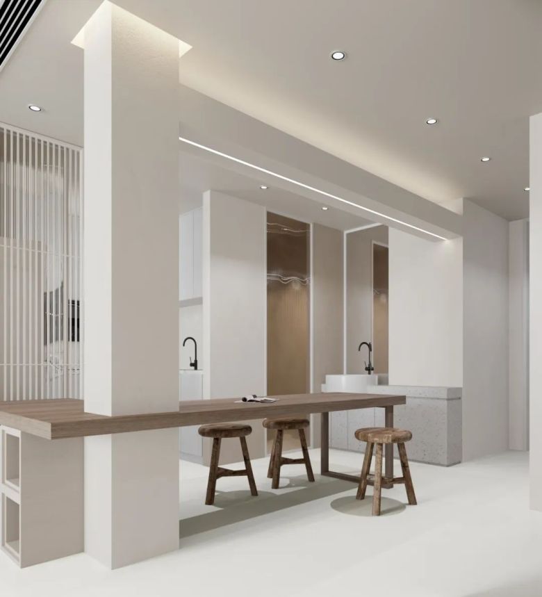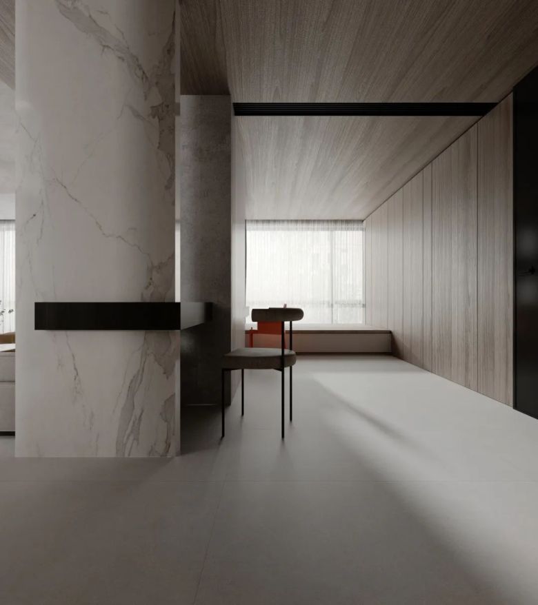其实不同的灯光效果,初晨白的表现力都不一样,喜欢酷冷一点的宝子们可以看看下图案例设计,没有冗杂的软装,很好适配轻松治愈感的原木风。