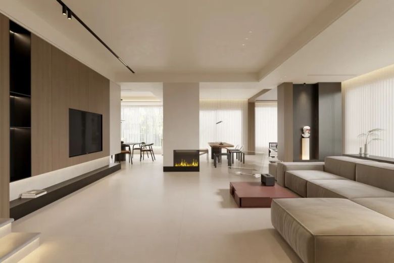 偏暖的初晨白应用在客餐厅一体,空间整体通过灯光的塑造显得更温馨;原木的墙面与电视背景墙点缀恰当,与素色砖相互相成展现新生的力量;几株绿植摆件,简单清爽。