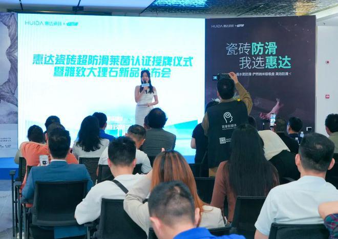以及网易家居、腾讯家居(智造联盟)、搜狐焦点、新浪家居、陶城报、陶瓷资讯、中国陶瓷网、陶业要闻、华夏陶瓷网、陶瓷信息、中陶家居网、建材周刊、华南家居装修网、直线传媒、华人设计师网、陶瓷新闻网、品牌中国等媒体的代表们;来自全国各地的惠达瓷砖经销商共同出席本次活动,见证国内惠达瓷砖首张“德国莱茵认证”超防滑证书颁发仪式和第三代超防滑新品“雅致大理石”发布。