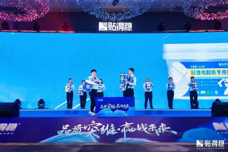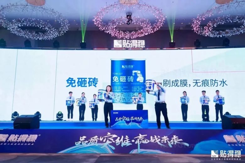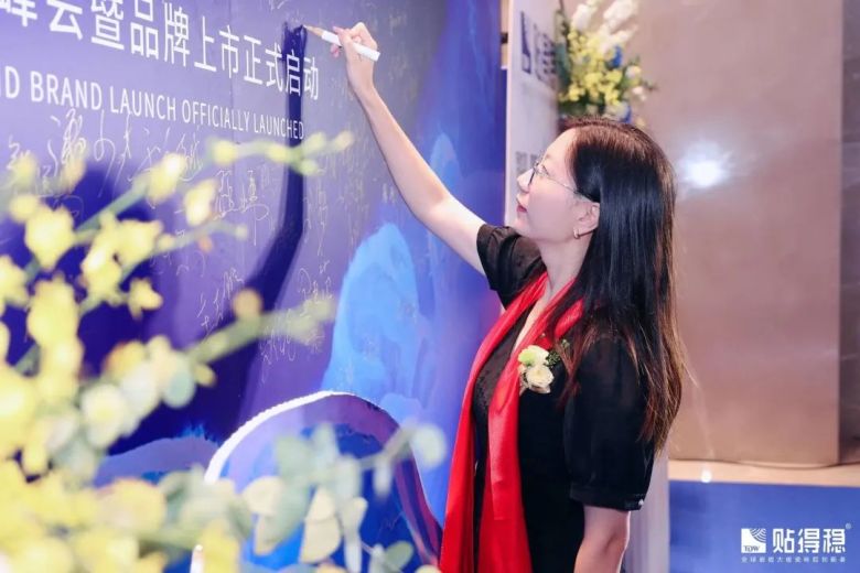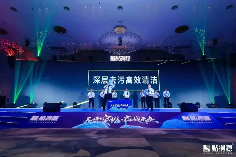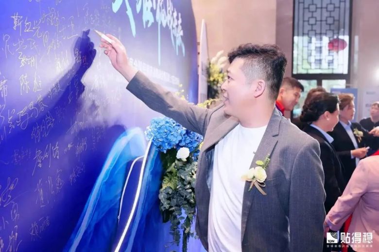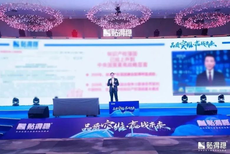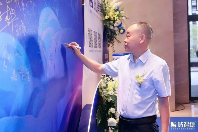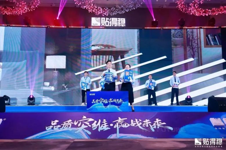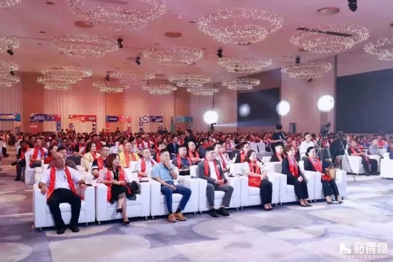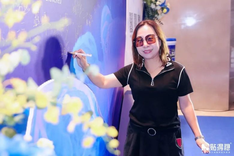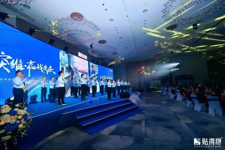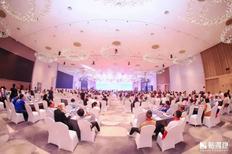 贴得稳品牌董事长胡媛女士、贴得稳贴新到家铺贴学院院长徐顺兰女士、贴得稳品牌首席财务官代华女士、贴得稳品牌产品研发博士/技术研发总工(TCE) 欧利平先生以及来自全国各地的合作伙伴、核心经销商代表等近千人齐聚一堂,共同开启贴得稳品牌的全新征程。