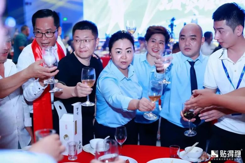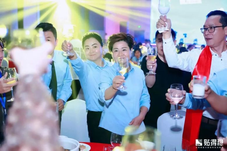 答谢晚宴在流光溢彩的镁光灯下盛大开启,贴得稳品牌董事长胡媛女士携品牌高管们一同祝酒,举杯答谢经销商家人们的到来。