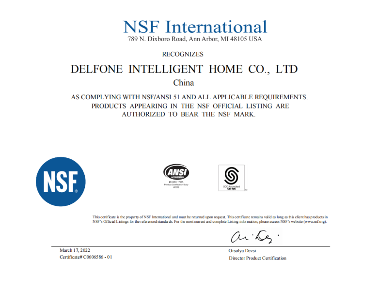 德利丰全系列产品荣膺“NSF食品设备认证”