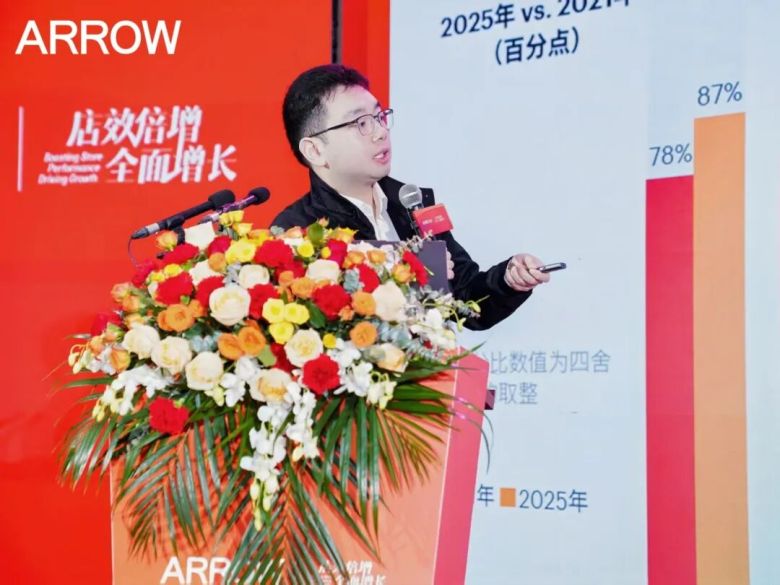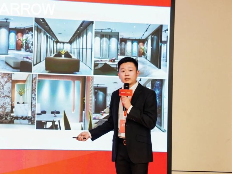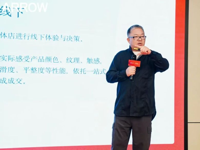 围绕终端门店的变革趋势,箭牌瓷砖事业部展厅设计总监吴琦进行了专题分享。他指出,终端门店正经历从产品陈列向场景体验的转型升级,并介绍了全新的A6 pro标准门店模型,强调将通过空间设计、场景营造与店态升级,系统提升终端形象与体验价值,助力经销商以“空间美学”驱动销售转化。