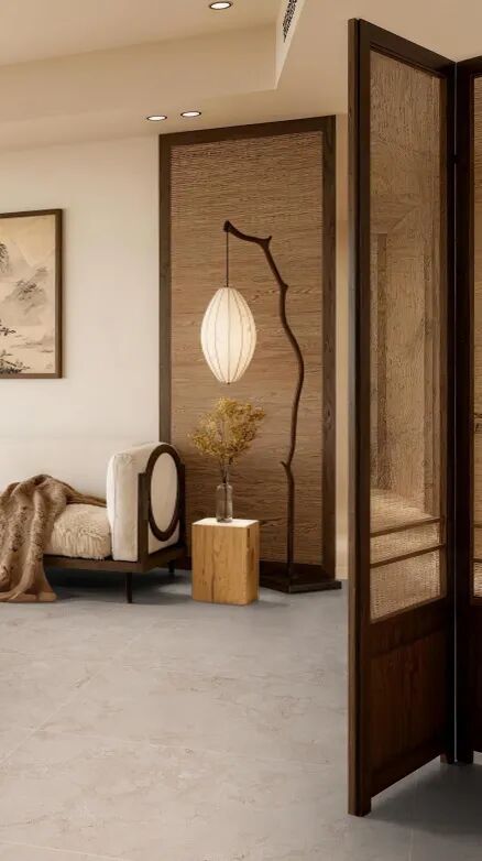 浅米色莱姆石通铺,搭配屏风、原木案几,阳光过隙,光影如画。一席蒲团、一方茶台、三两卷古籍,再现宋人“晴窗细乳戏分茶”的闲逸。