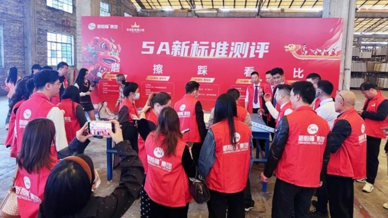 在参观过程中,从“高铁时代”窑炉到西班牙陶丽西釉料,新恒隆集团对于瓷砖生产工艺的高标准和产品质量的严要求,让到场嘉宾表示高度赞赏。在5A标准产品体验现场,通过【磨擦踩看比】的性能测试,针对瓷砖的表面耐磨性、耐污持久性、断裂模数、辊棒印、静摩擦系数等5A标准指标进行现场测试,让嘉宾们亲身体验到新恒隆集团产品的硬核品质。