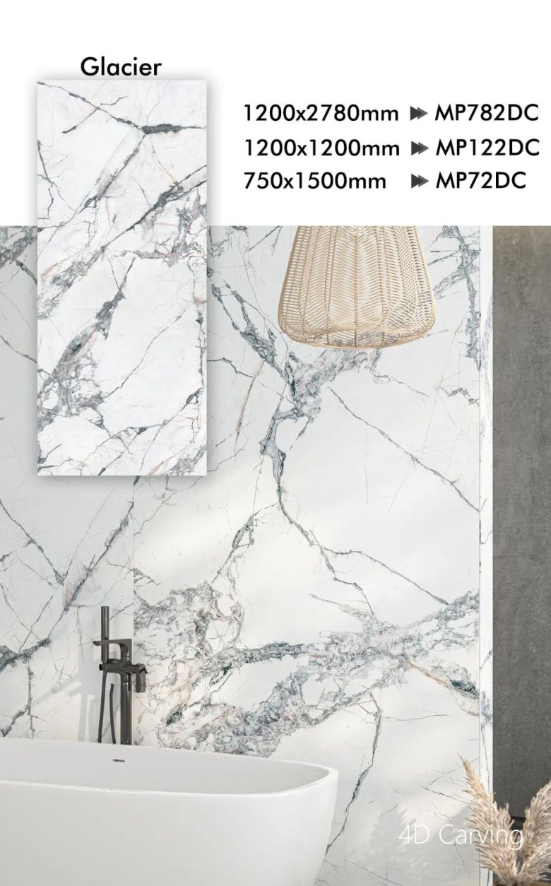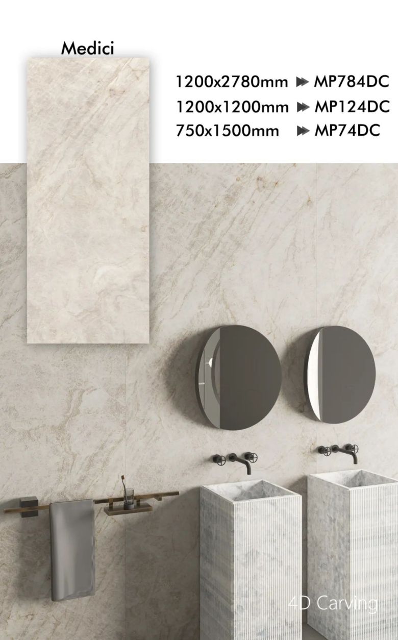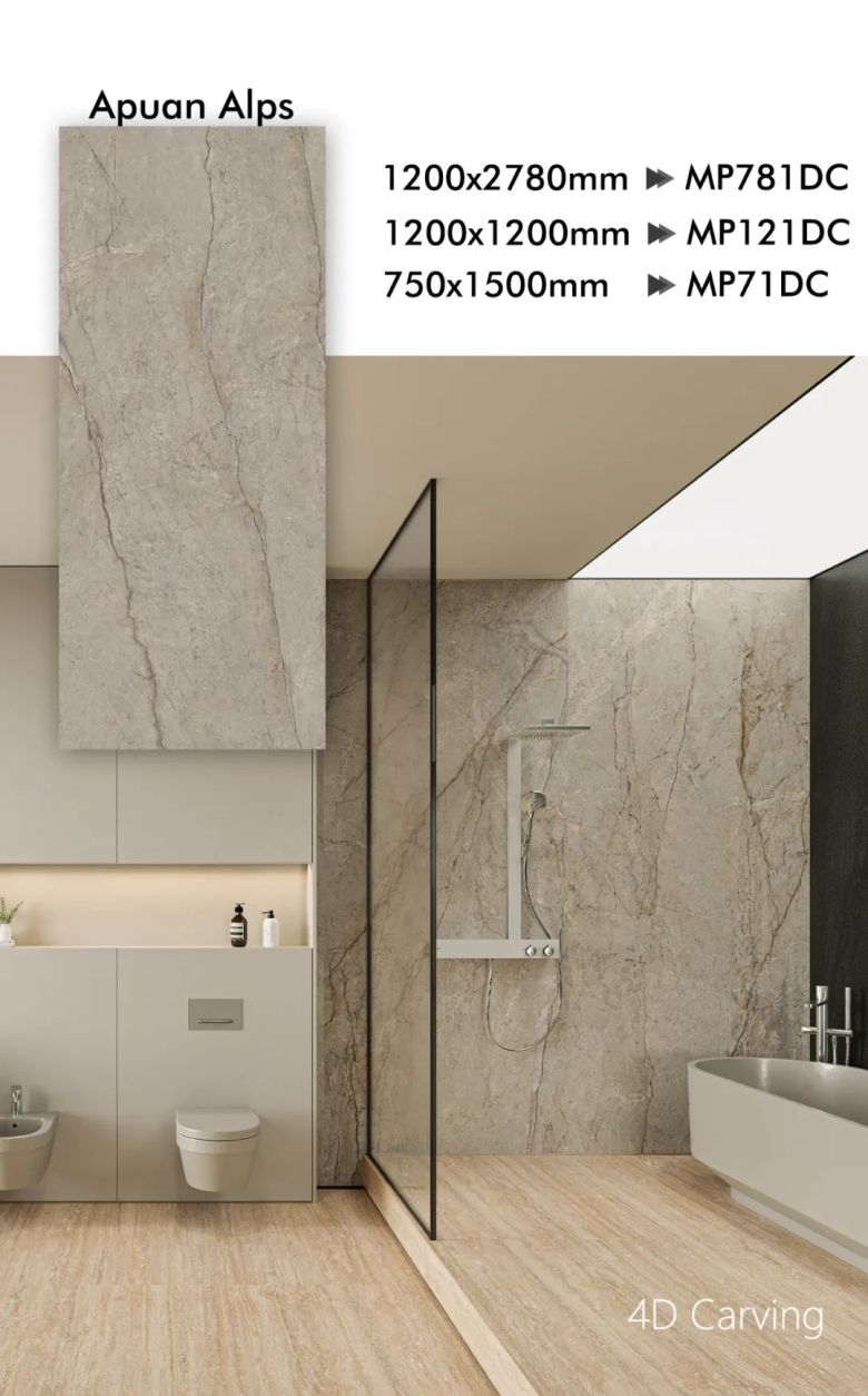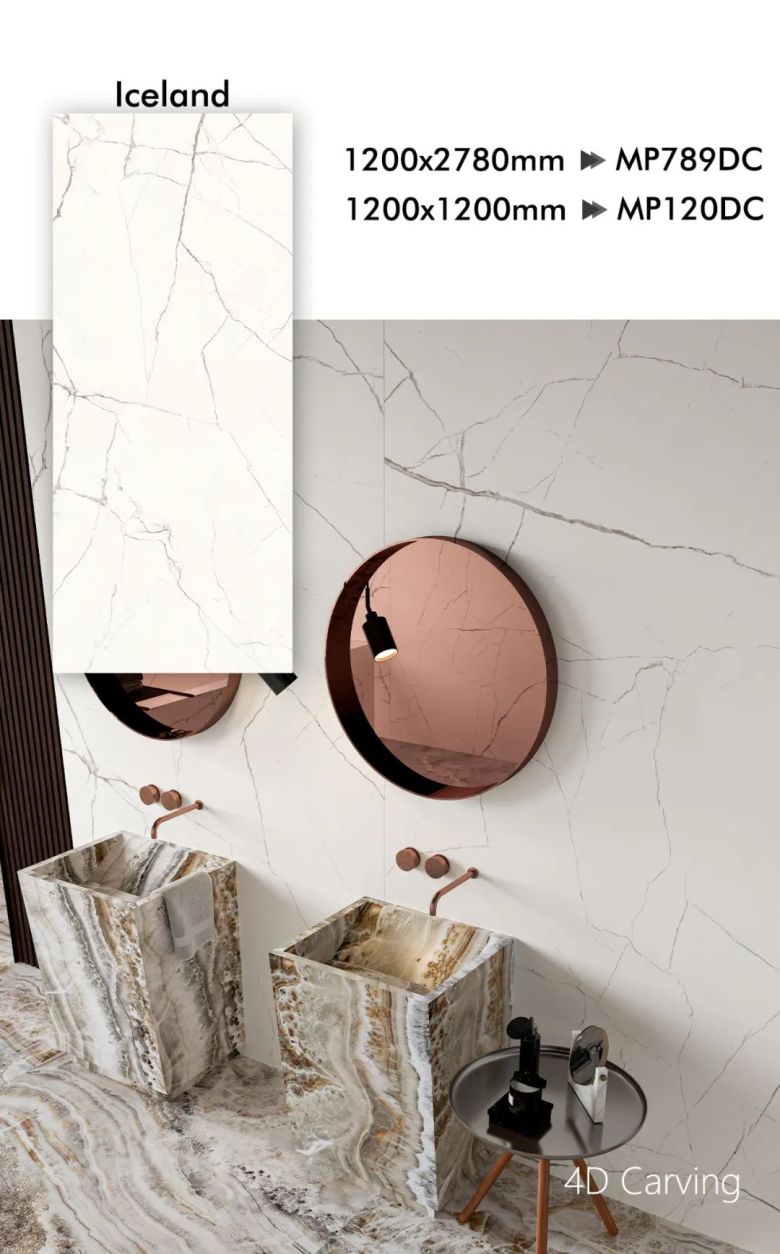 纳米干粒在表层肌理中无规则分布,形成柔和的漫反射效果,在阳光、灯光的折射下释放出一种低调而高级的光感。它既抛弃传统高亮瓷砖的工业感,又保留天然石材那种润泽微光的肌理表现。