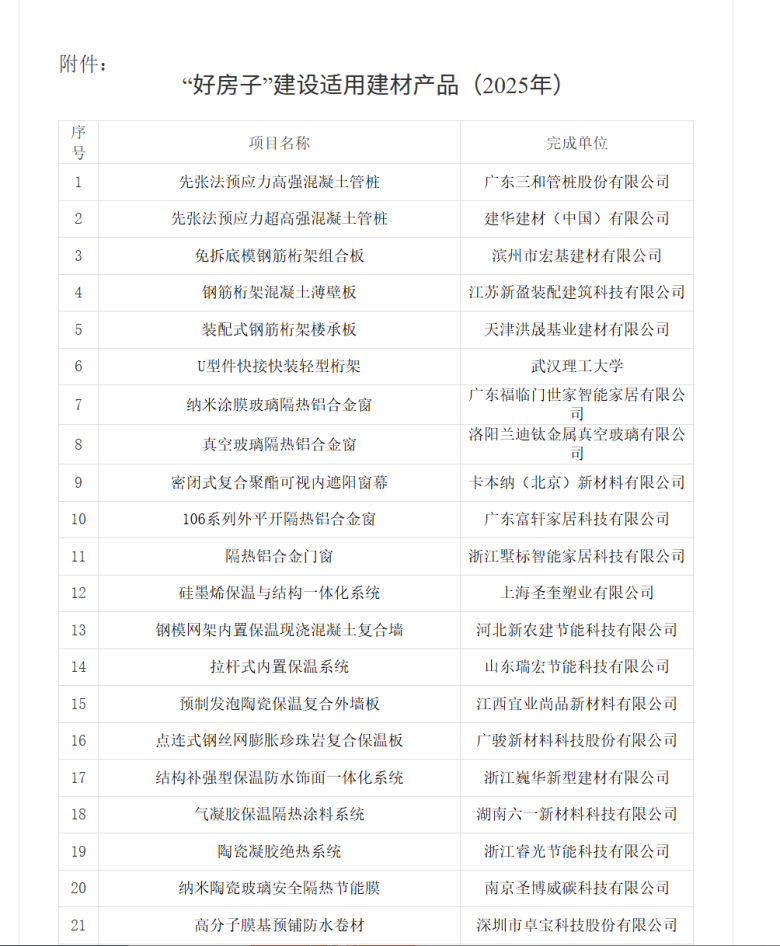 日前,住建部科技与产业化发展中心正式公示《“好房子”建设适用建材产品(2025年)》名单,46项建材产品脱颖而出。其中,建筑陶瓷行业表现亮眼:索瓷公司的集成岩板-护墙板、简一的大理石瓷砖、新明珠和东鹏的防滑砖等产品成功入选。