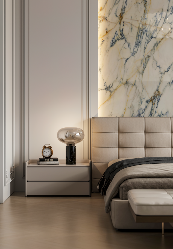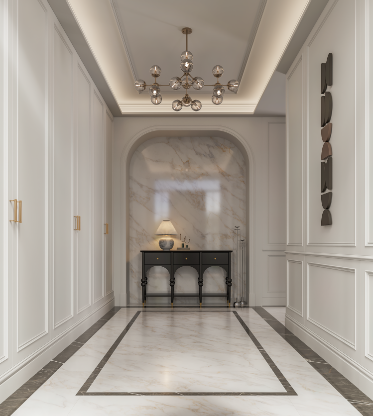 遵从内心热爱生活、装点生活,在法式轻奢风空间也可将生活过成诗。在空间中,密缝铺贴900×1800mm尊石岩板意大利白,稀有奢石纹理游移于牙白色砖面,浪漫法式回廊搭配典雅软装,勾勒出浪漫法式风情。