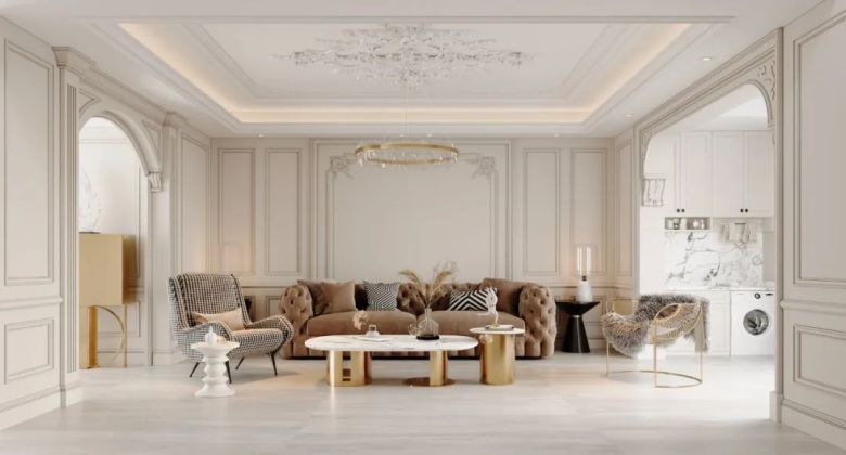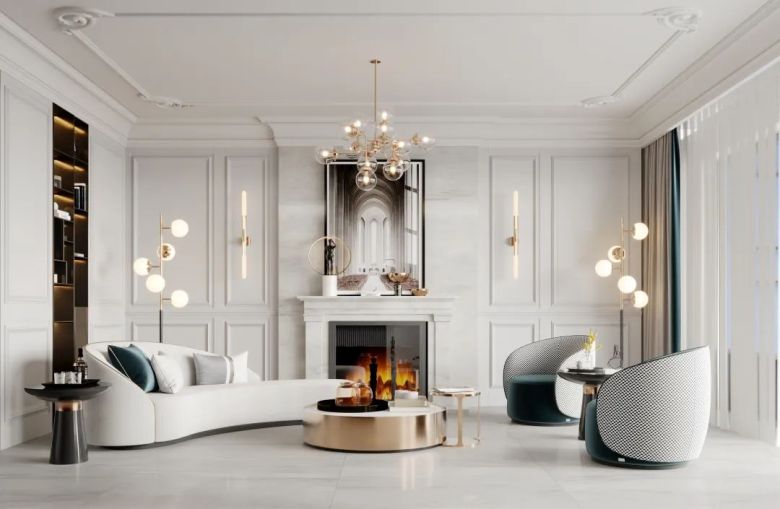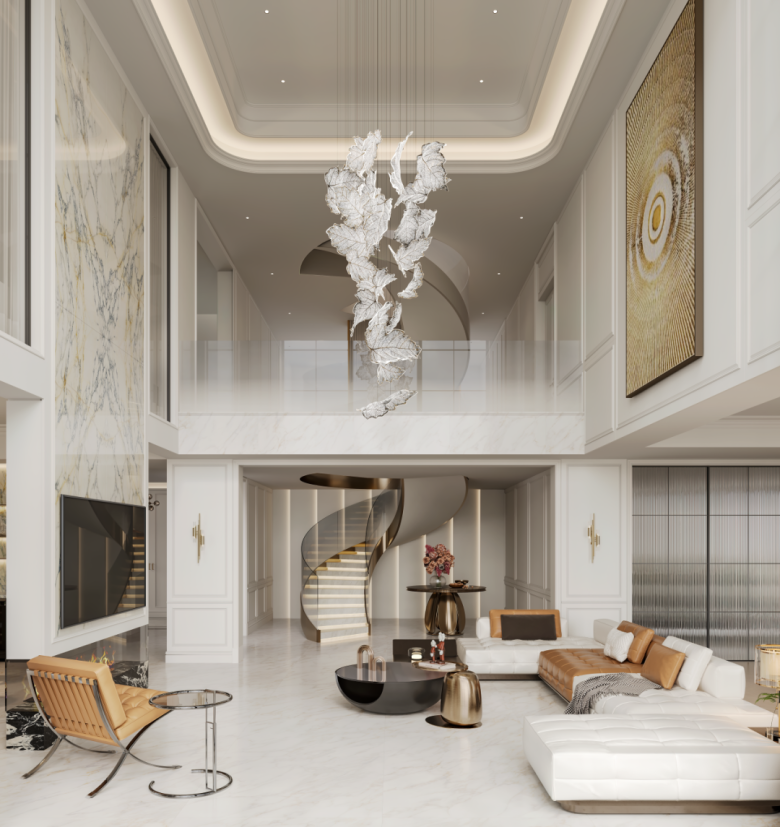 璀璨的法式吊灯如日光倾泻而下,旋转楼梯作优雅背景,奢石肌理与法式软装共同营造画报般美学空间,生活细碎日常也成浪漫艺术。