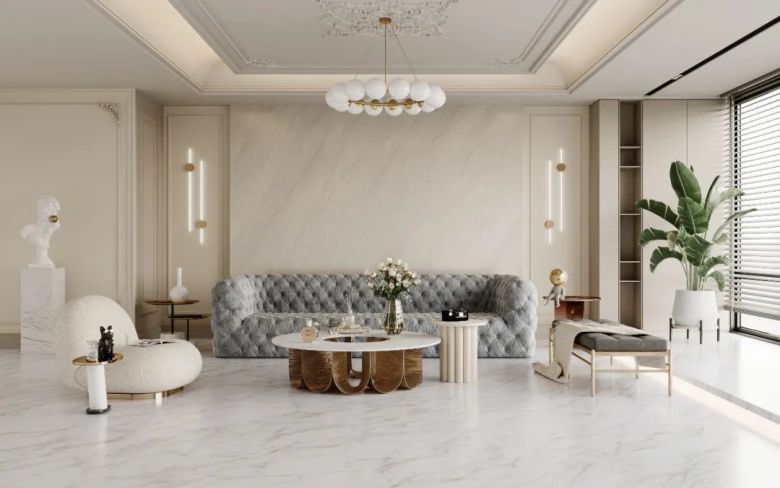 运用柔和色彩,在家营造阿那亚的同款浪漫疗愈场吧。柔和肌底搭配多巴胺点缀色,是法式轻奢风的色彩美学。客厅地面铺贴1200×1200mm尊石岩板迪奥金,质感釉面搭配稀有奢石纹理,构筑空间舒适恬静氛围。