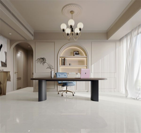 延续了整体调性设计的书房,墙面、顶面法式线条的点缀提亮了视觉效果,简洁明朗的色彩与沉静内敛的软装材质相呼应,自由温煦的光照进书房,给空间加上了一层温柔滤镜。