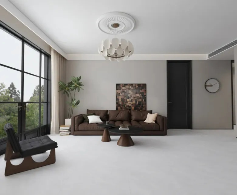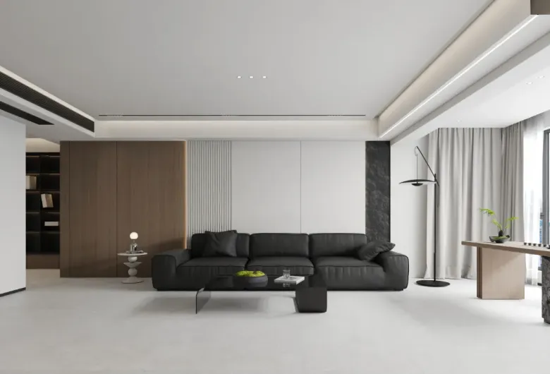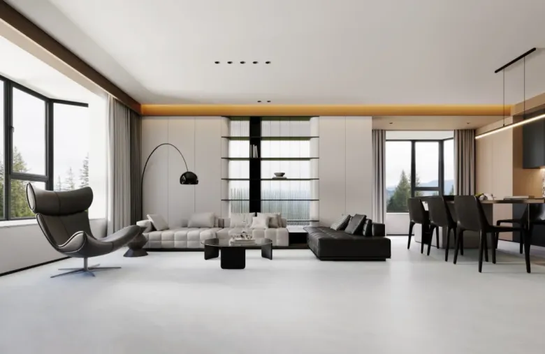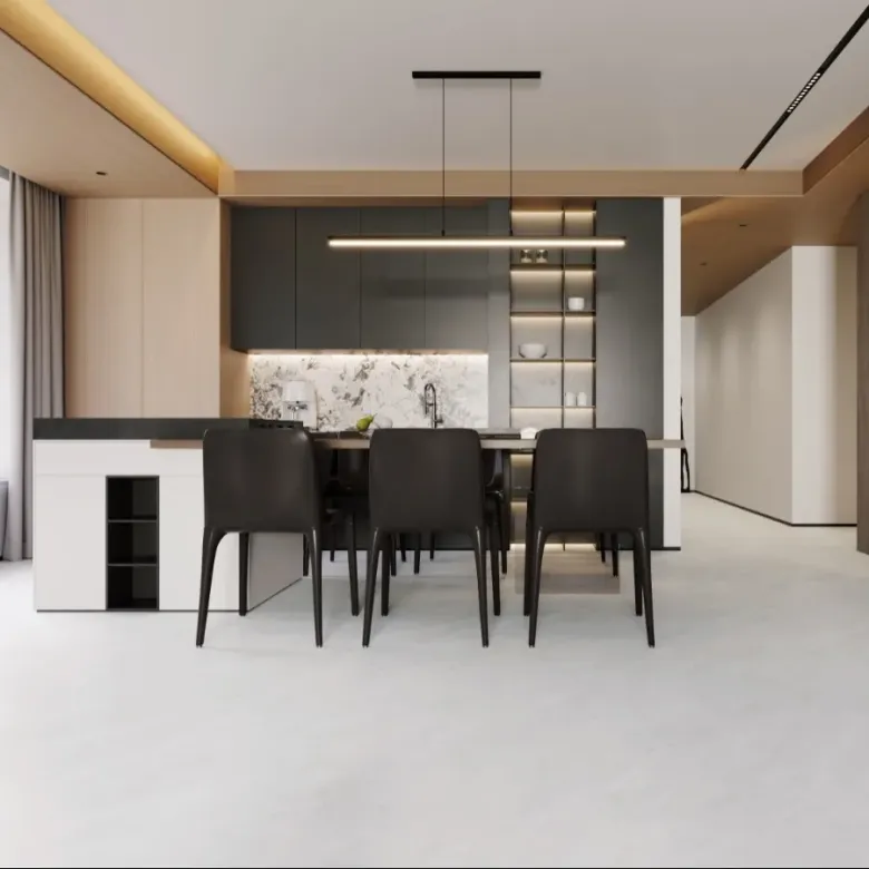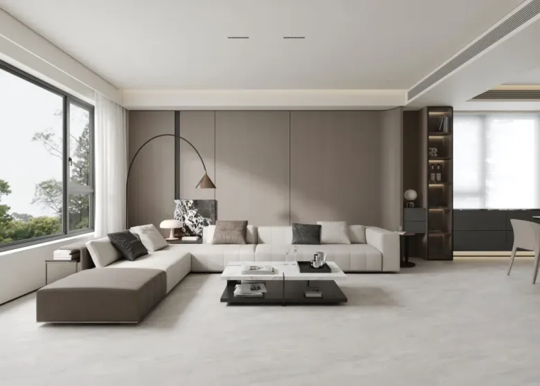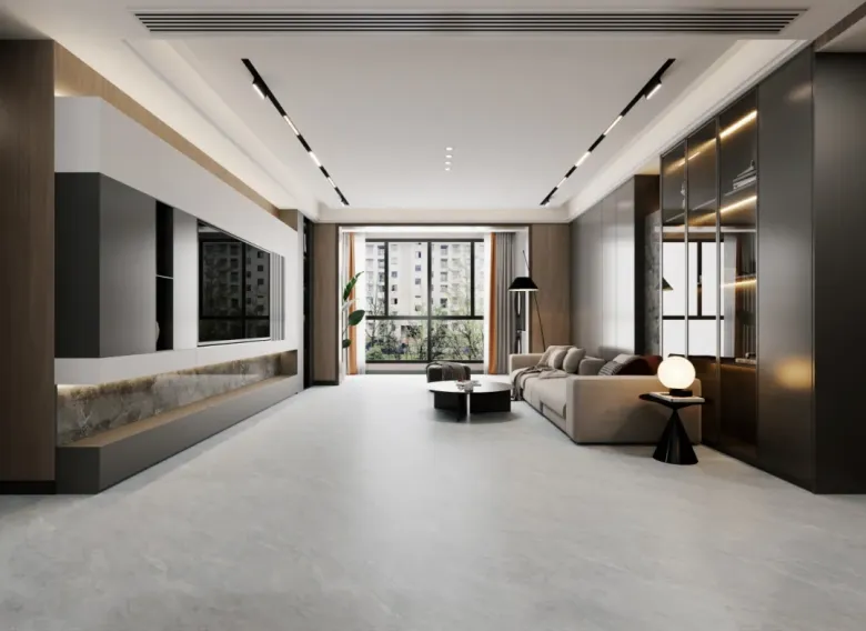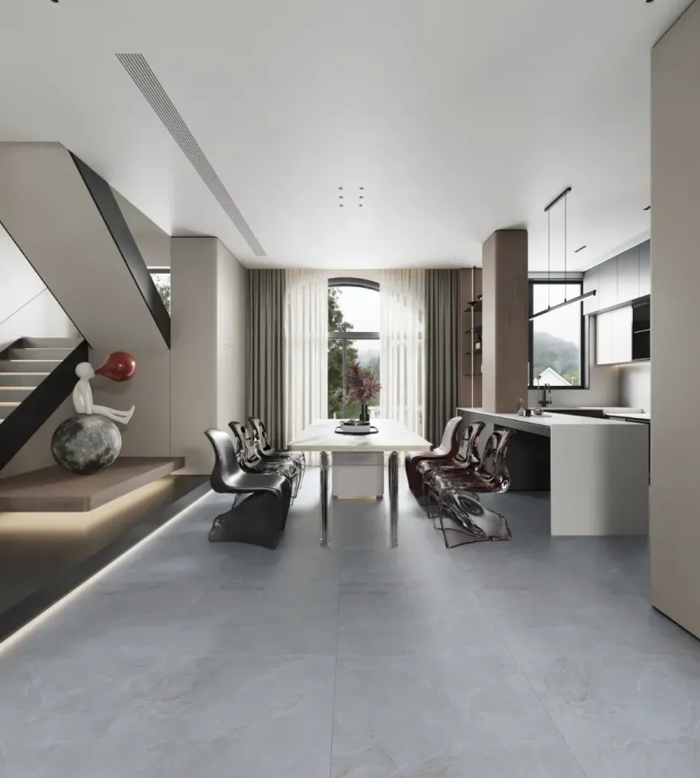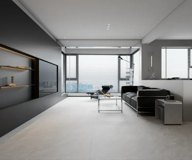 产品与众不同的质感表面,为家居生活空间提供无限想象和艺术灵感。地面的铺贴连贯自然,在增强空间的层次感和设计感的同时,也强调了现代设计的简约与秩序。