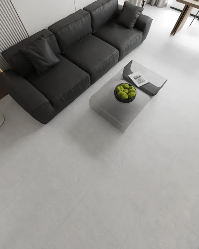 产品的天然纹理细腻雅致,柔和之中绽放优雅格调。客厅的沙发、玻璃茶几、木质餐桌等家具与浅色的瓷砖形成了鲜明的对比,简洁风格与现代设计完美融合,共同打造出一个时尚、舒适的居住环境。