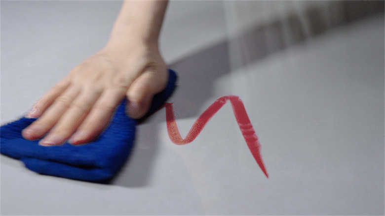 首先在砖面上用口红涂画下痕迹,10分钟过去后,用抹布将痕迹擦去,砖面光洁如新,并无留痕。路易摩登皎皎子母砖采用多重制作工艺,独有的防污保护釉,防污性能达4级,无惧污渍,画不花,清洁更简单,减少家务时间,轻松又舒心。