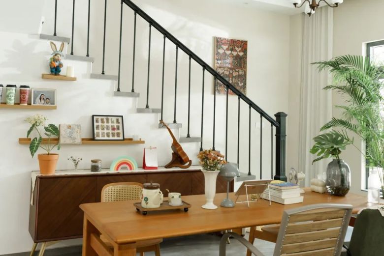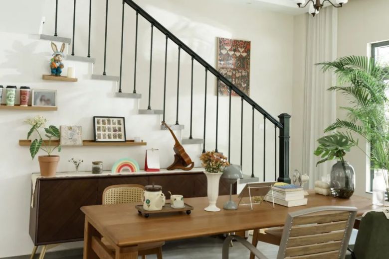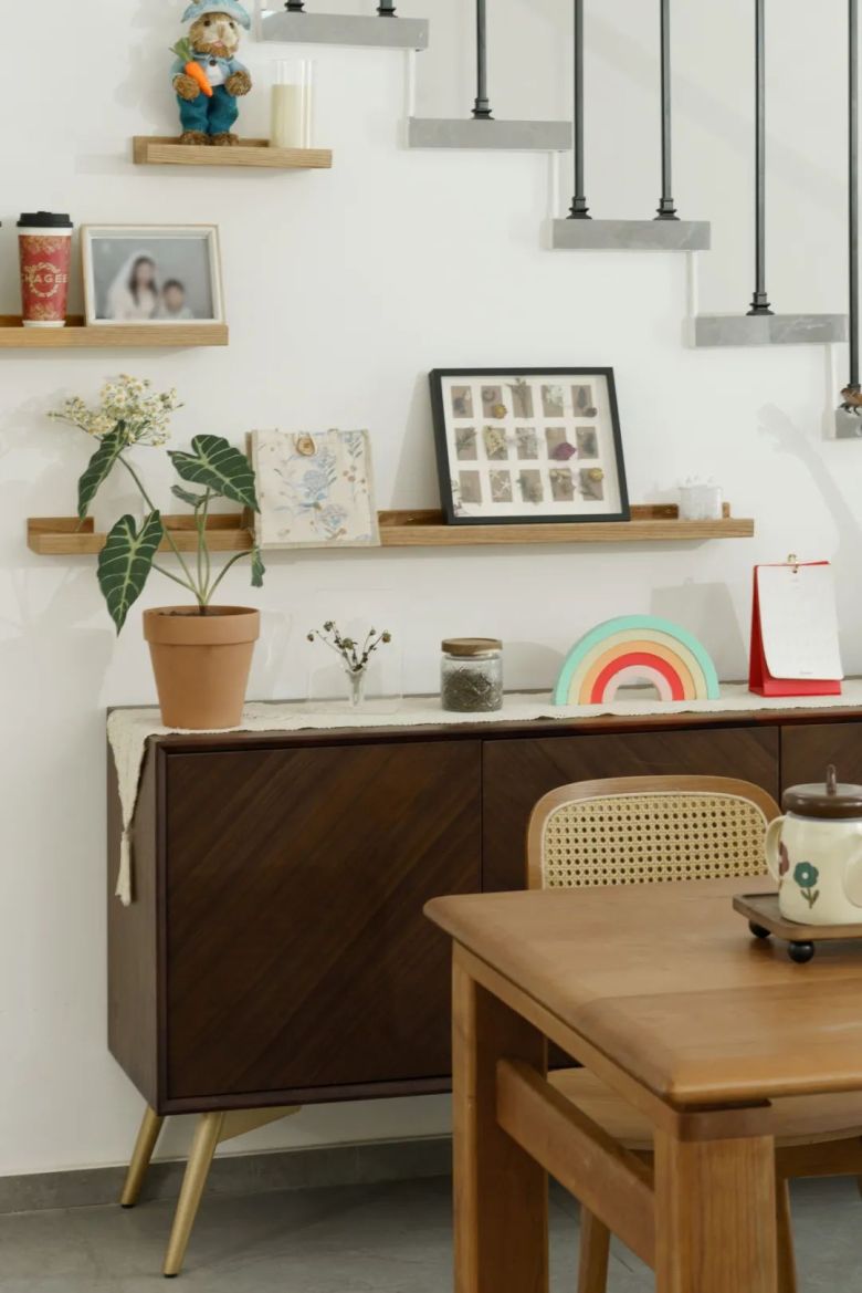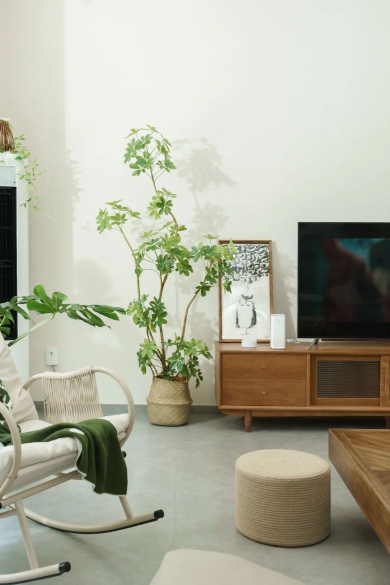 原木质地的餐桌、茶几、电视柜把整个休闲会客区域连成一体,搭配上简约风格的沙发和休闲椅和点缀的片片绿植,一比一还原了童话世界里恬静美好的生活状态。