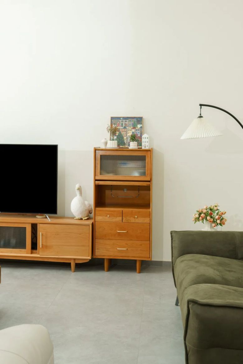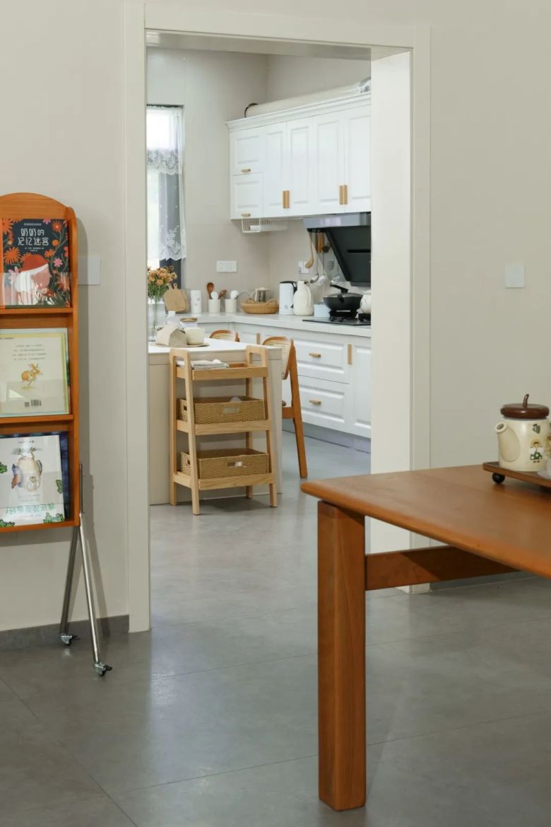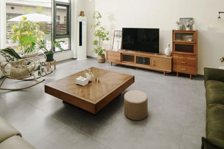 在客厅中,童话般绚烂的色彩与小巧精致的物件,与地砖巧妙地编织出一幕幕引人入胜的故事篇章。浅灰色地砖如同一条沉稳、安静的主线,贯穿整个空间,为故事奠定了宁静而深邃的基调。