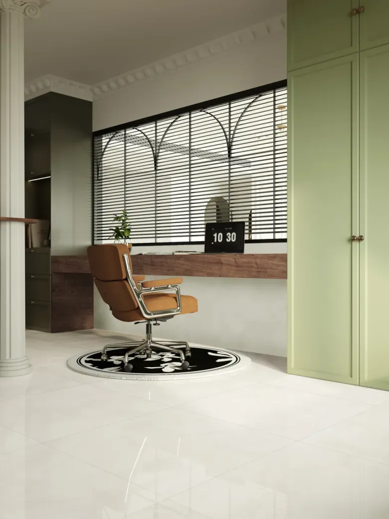 步入书房,适当的留白是提升空间质感的关键。自然垂落的窗帘与复古木质百叶窗相映成趣,光线透过缝隙洒落,营造出一种静谧而悠长的岁月感。