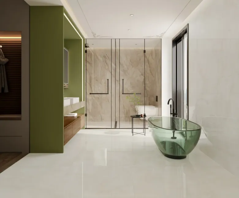卫生间采用分段式设计,既方便又简洁。玻璃门的巧妙运用,为卫生间引入了自然光线。背景墙采用独特设计的奢石纹理瓷砖,以绿色玻璃浴缸点缀,让卫生间也充满了艺术气息。