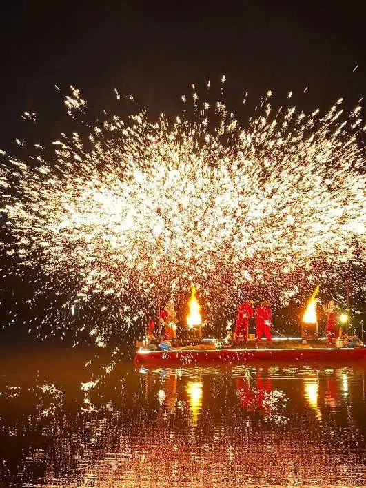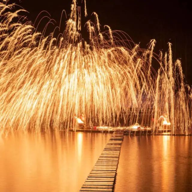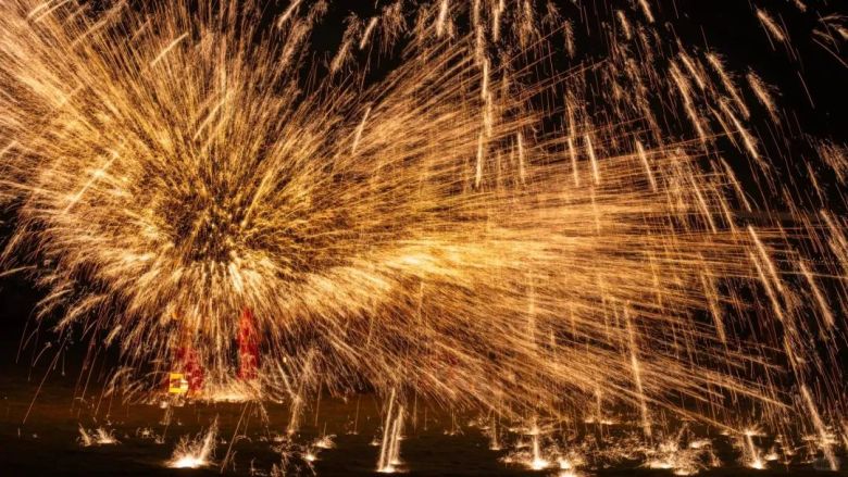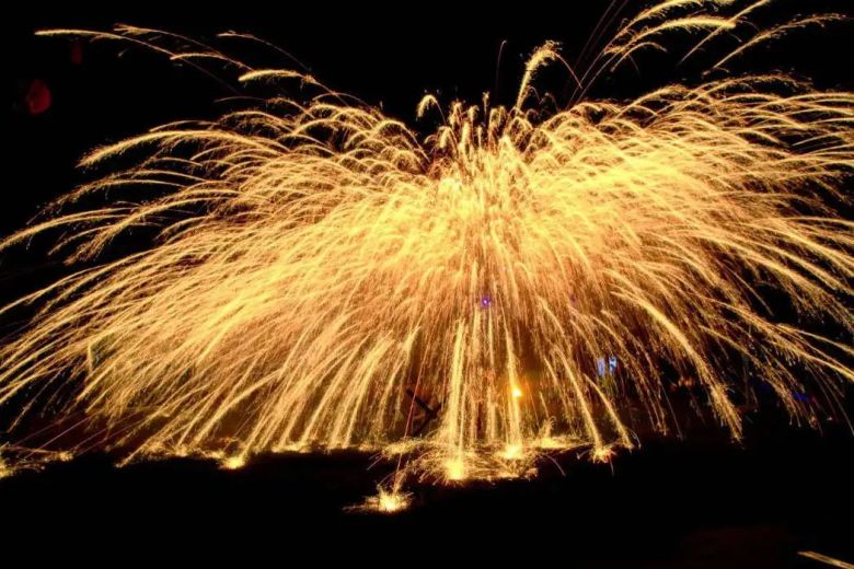当滚烫的铁水升至1600℃,匠人手持木勺奋力扬空,炽热的金红熔液瞬间与黑夜相撞——一勺铁水泼苍穹,似银河倾泻、流星坠地,漫天金花如瀑飞溅;一击成花耀古今,铁与火的狂舞中,“火树银花不夜天”的诗意从唐宋穿越千年,在紫南芳华谷的夜幕下磅礴重现!