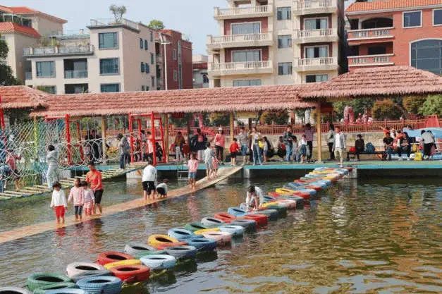 水上挑战区玩出新花样——晃悠浮桥、摇摆木桩溅起清凉水花,掉进水里也是欢乐加倍!