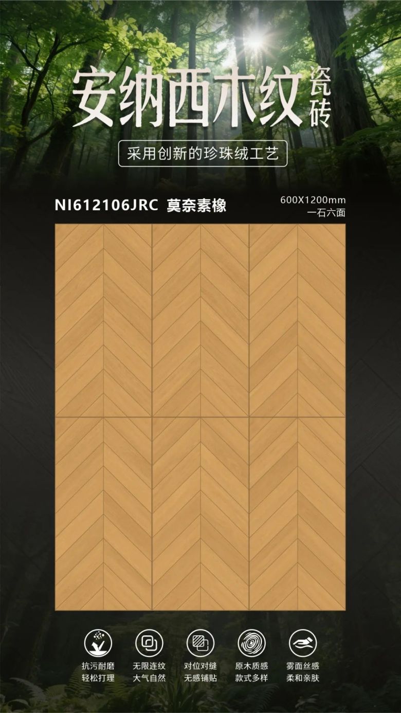 能强瓷砖安纳西木纹,创新珍珠绒工艺,打造出雾面丝感,让产品触感柔和亲肤,同时还原原木光感,测看的微光细闪点缀,妥妥拿捏空间超强视觉。