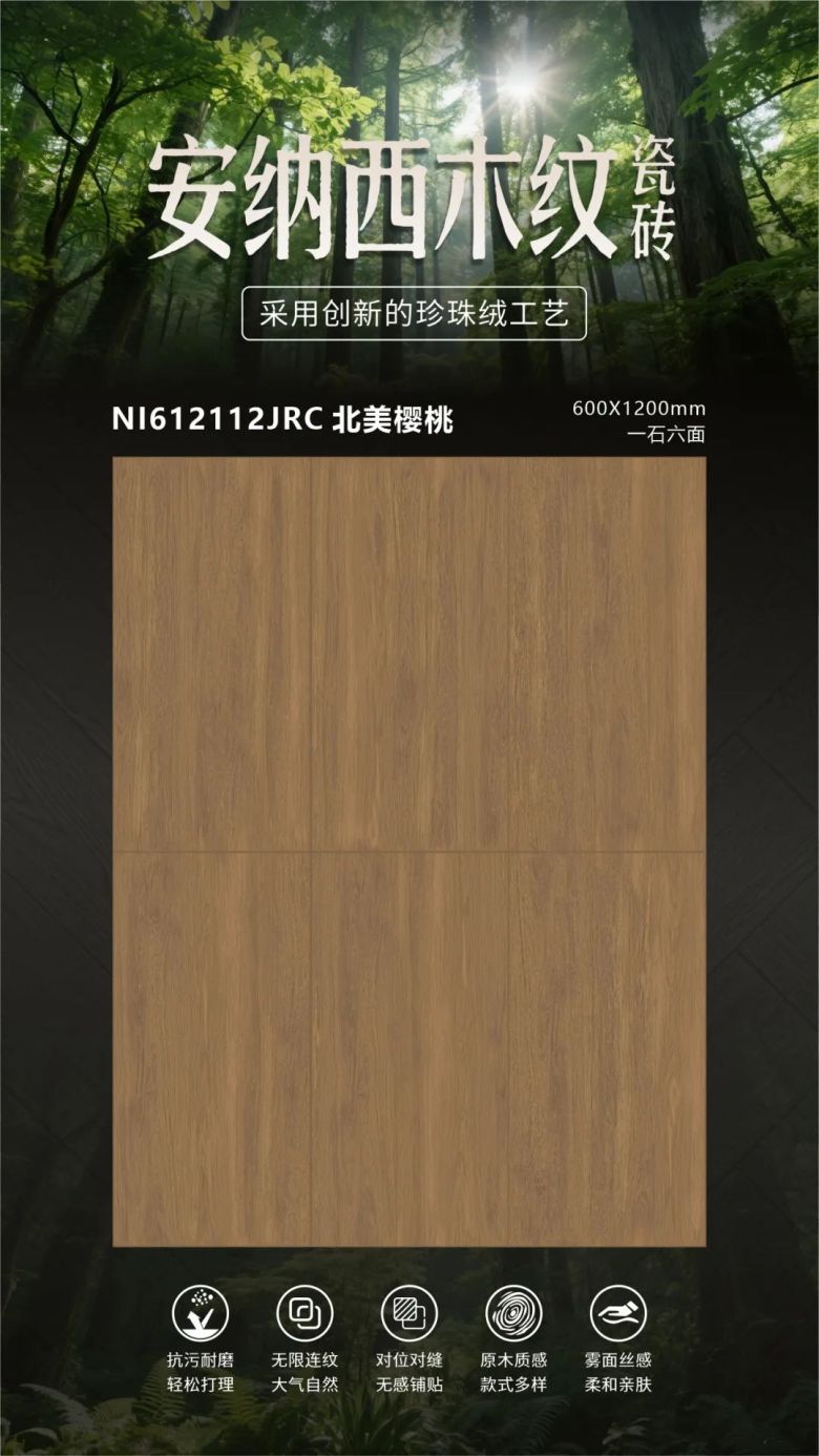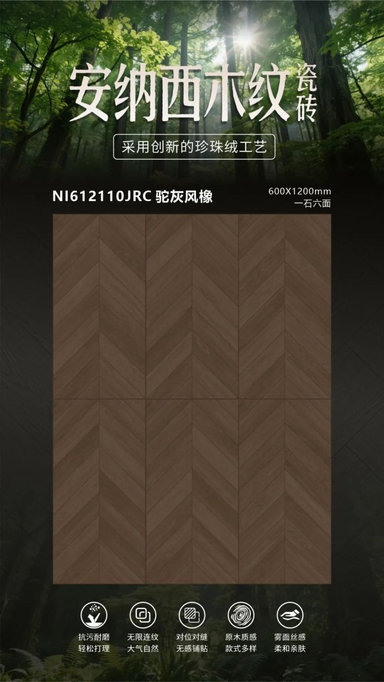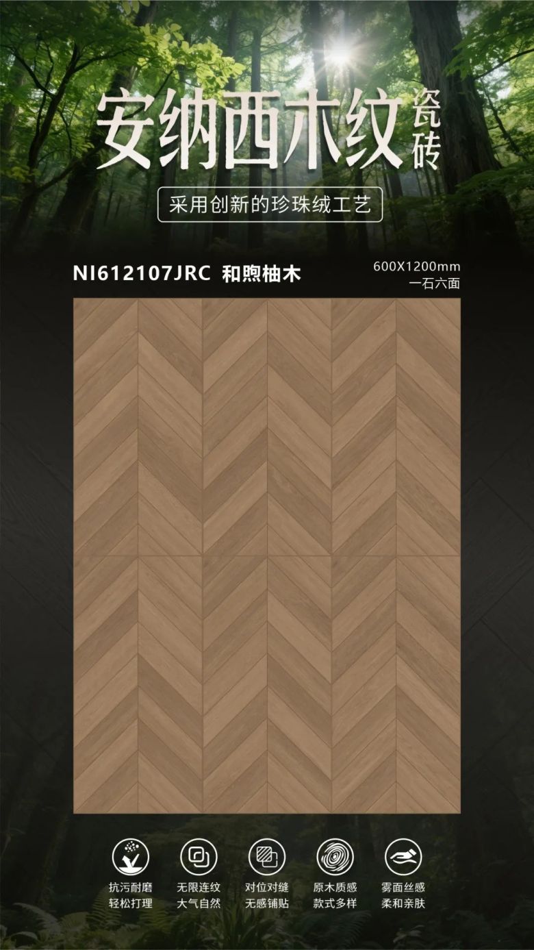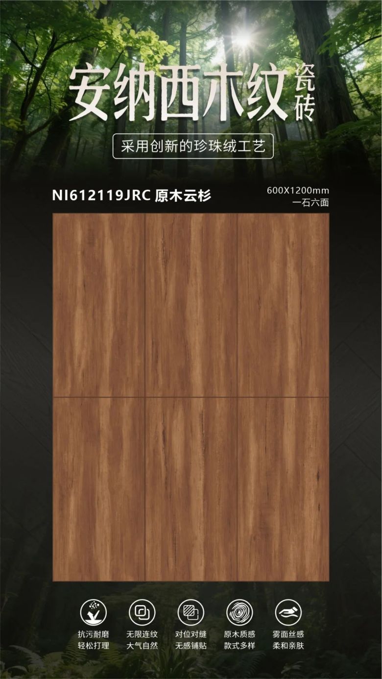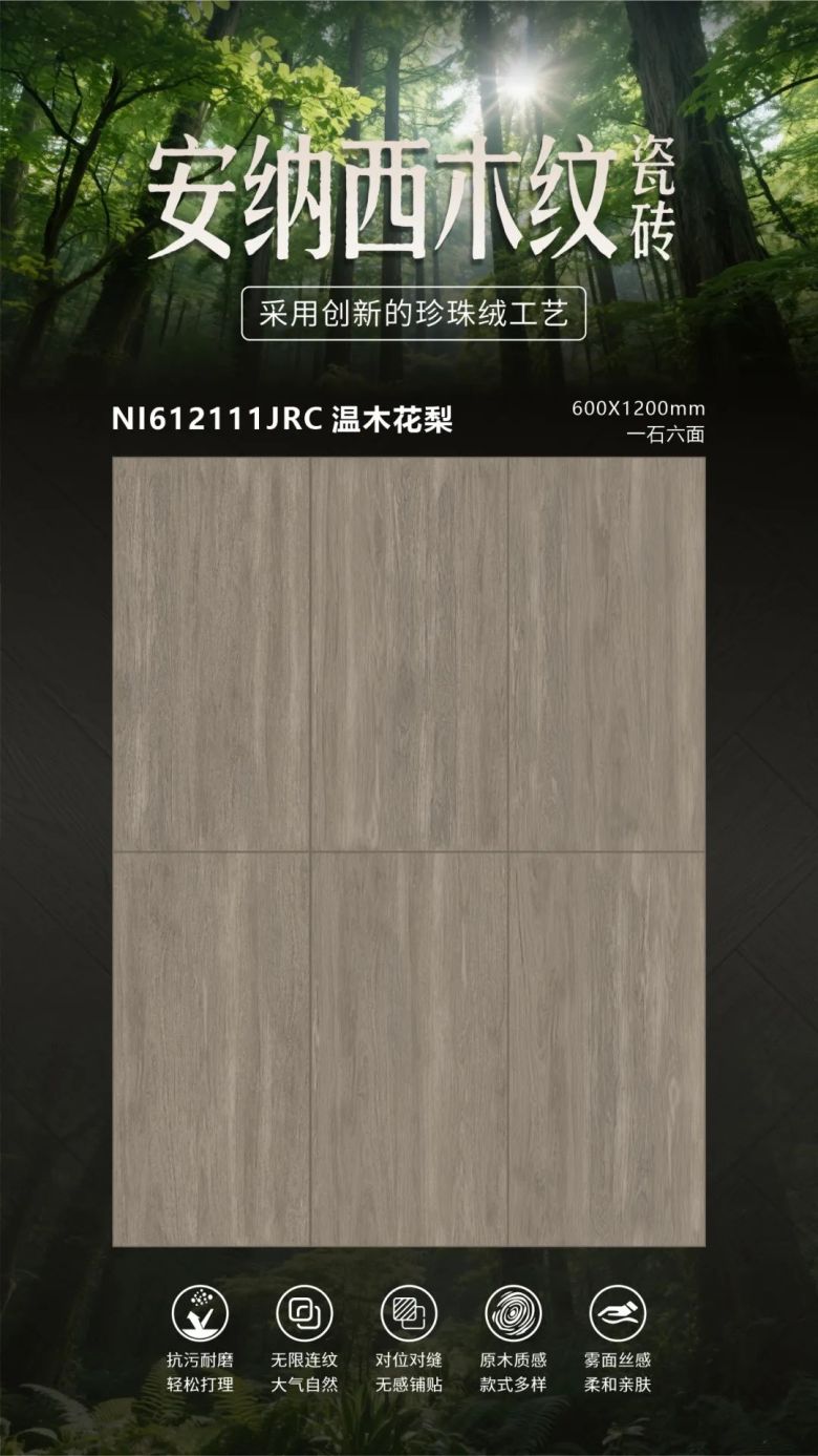 颜值在线,实力满分。能强瓷砖安纳西木纹超多款式选择,产品抗污耐磨性能显著优于传统木纹砖,应用主打一个省心又省力!