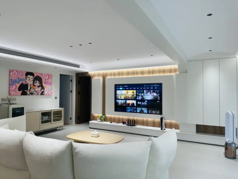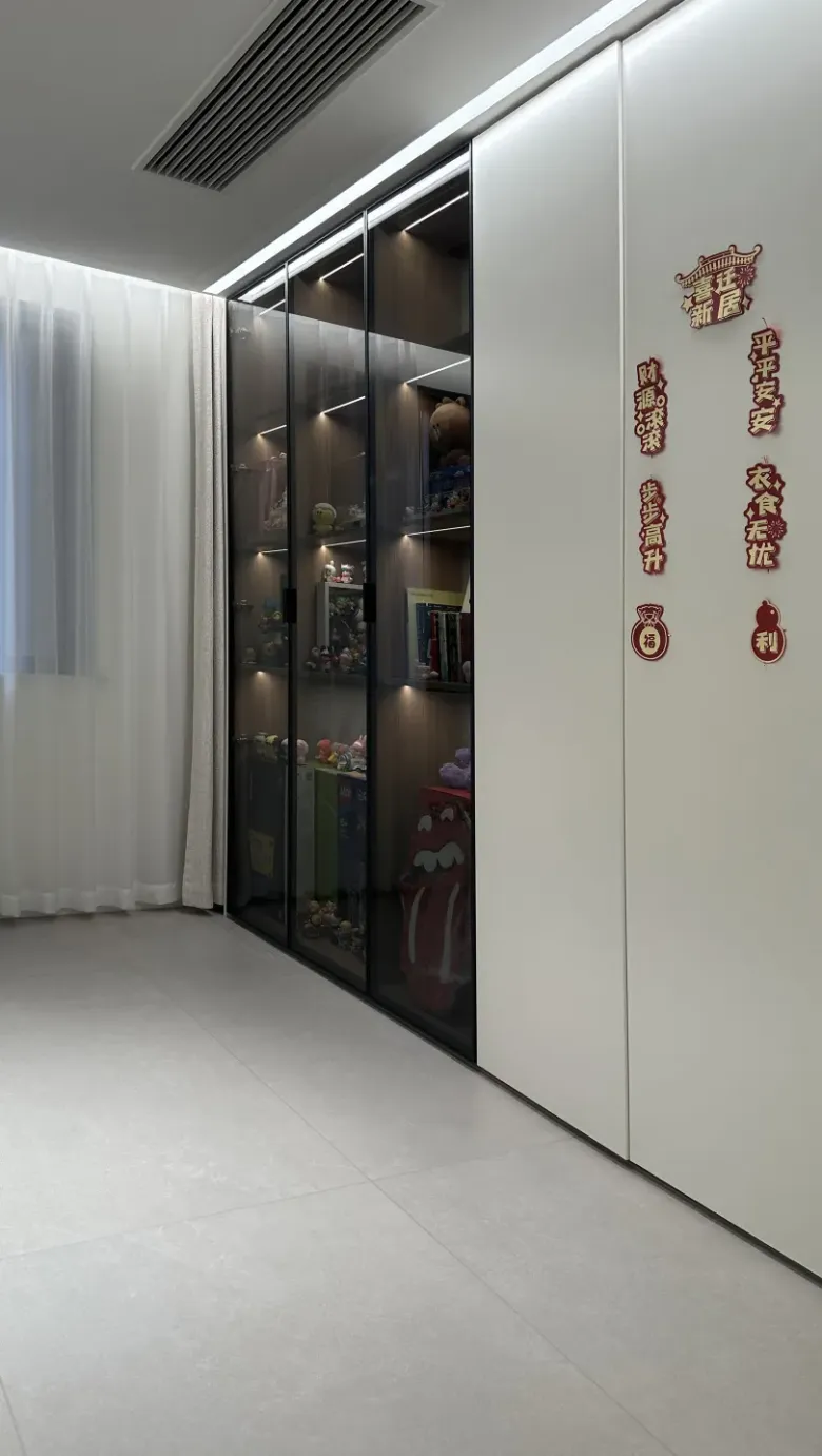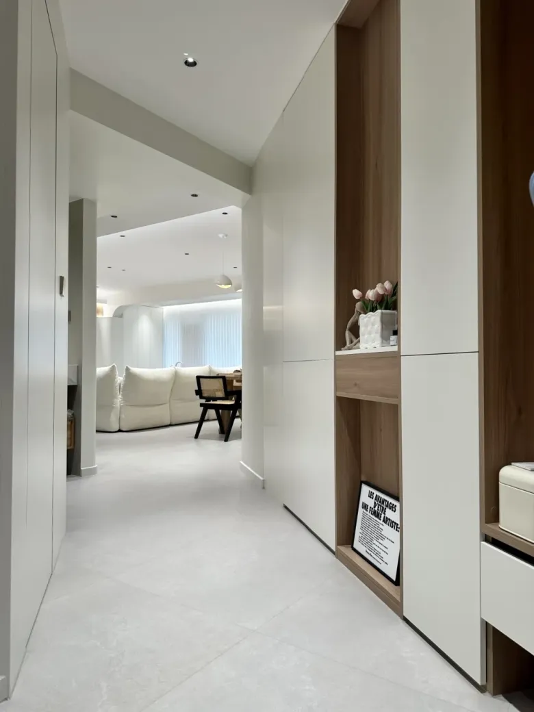 入户处是家的第一印象,整体布局简洁有序,并无太多杂乱的装饰,一眼望去,温馨舒适的客厅若隐若现,更是令人充满了归家的喜悦与期待。入户处的一侧是奶油风与原木风巧妙融合的整墙收纳柜,另一侧则是设计精巧的洗漱台,这样的布局不仅为主人提供了丰富的实用空间,更让每日的通勤变得轻松自在。