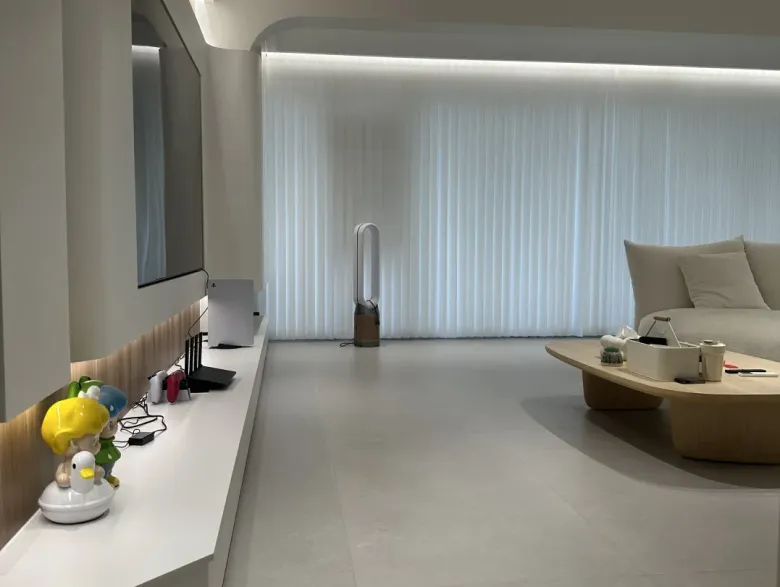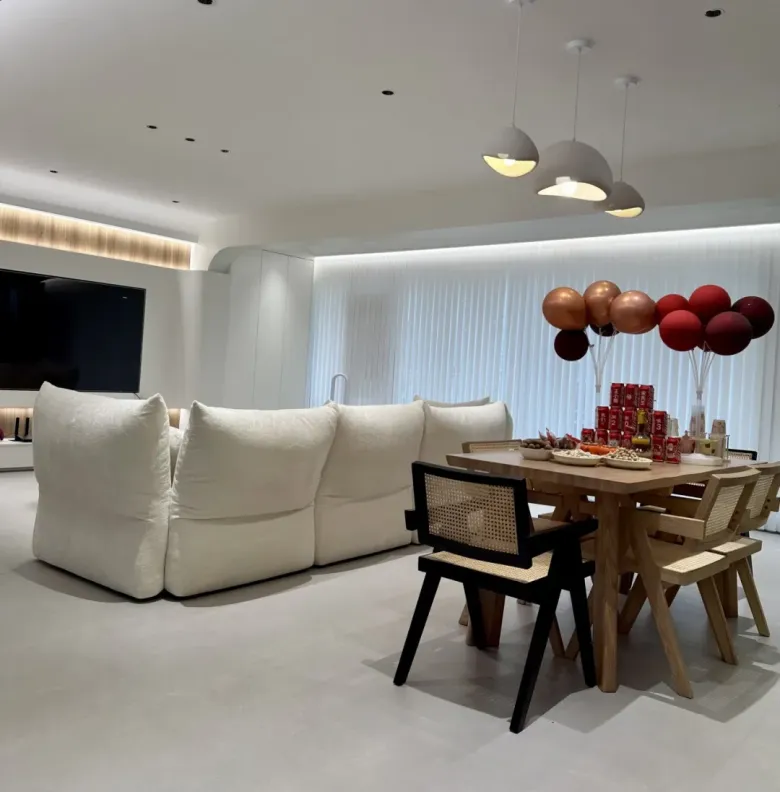 为了实现这一诉求,设计师与屋主曾多次深入沟通,共同探讨如何将原木奶油风格与家居生活的实用性相结合。最终决定选用鹰牌陶瓷【素奢·微水泥】系列的阿特拉斯浅灰作全屋搭配,其柔和温润的浅灰色调搭配绿色环保的原木家具,不仅彰显了自然与健康的生活理念,搭配视觉感良好的无主灯设计,更为整个空间增添了一份温暖与舒适感,无形中营造出一种自然、轻松的家居氛围。
