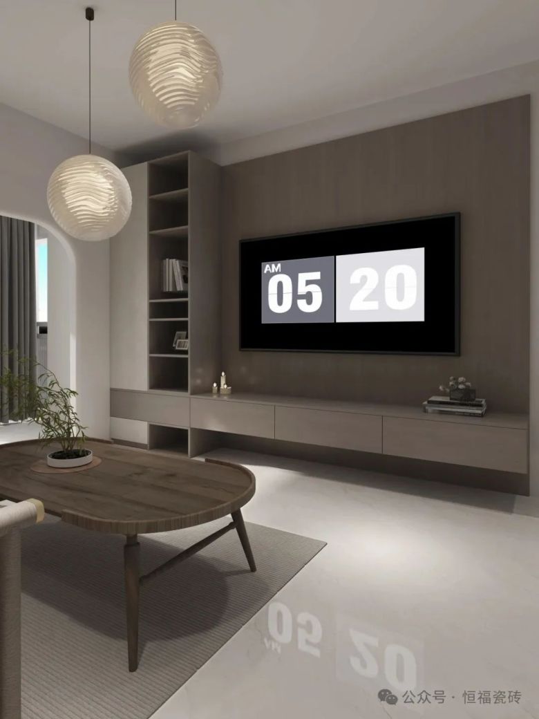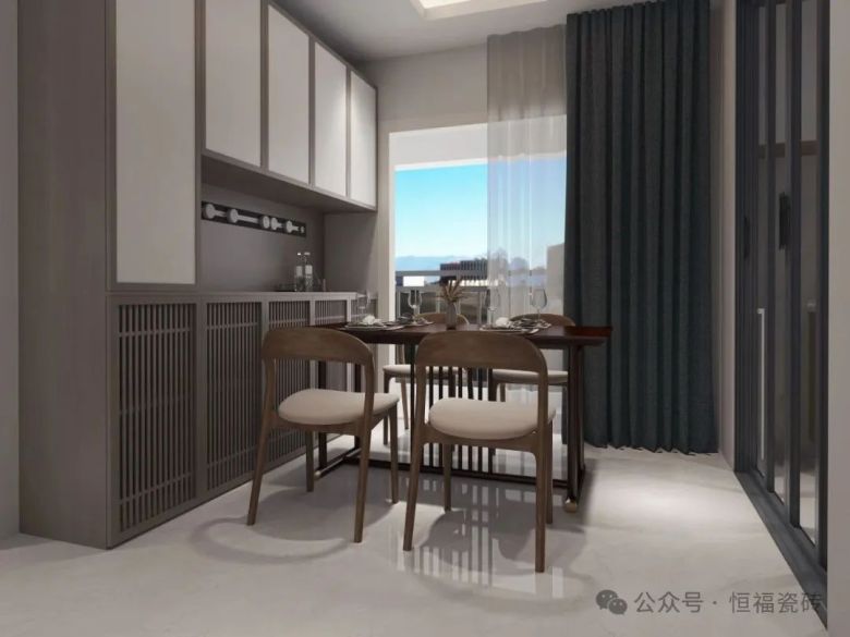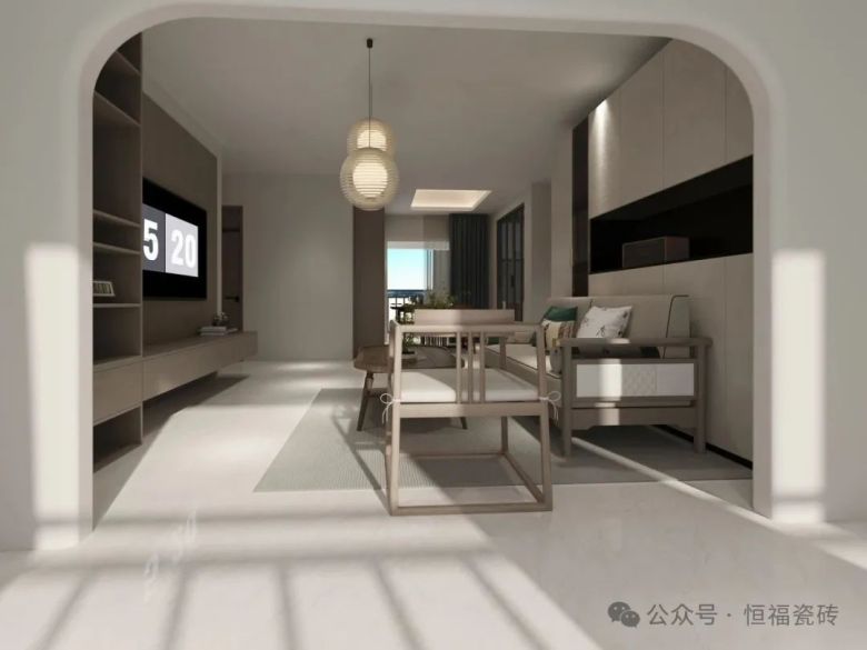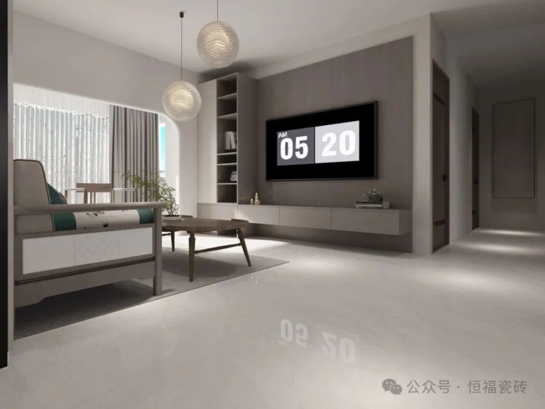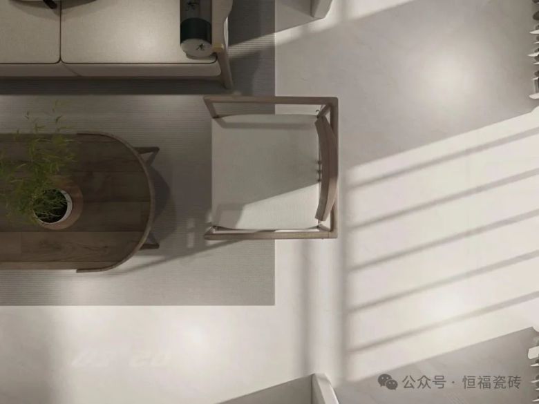 通铺烟雨灰瓷砖,居所瞬间注入宁静悠远的宋式美学。客厅里,它是空间的底色,搭配简约家具,如宋画中的留白,营造远离喧嚣的静谧。