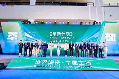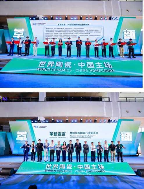 开幕式现场发布《革新宣言》,中国建筑卫生陶瓷协会、中国陶瓷工业协会、中国建筑材料流通协会、广东省陶瓷协会、佛山市陶瓷行业协会、广东东鹏控股股份有限公司、广东宏宇集团有限公司、广东鹰牌实业有限公司、广东金意陶陶瓷集团有限公司、佛山市金九方陶瓷有限公司、广东简一(集团)陶瓷有限公司、蒙娜丽莎集团股份有限公司、广东蒙创致远新材料科技有限公司、高安罗斯福陶瓷有限公司、淄博金狮王科技陶瓷集团有限公司、佛山中国陶瓷城集团有限公司共同宣言:以绿色智造降低生产端碳排放,构建产品全生命周期服务体系,加速人工智能在生产决策端的应用落地。
