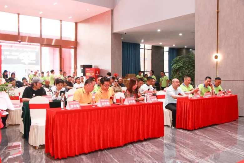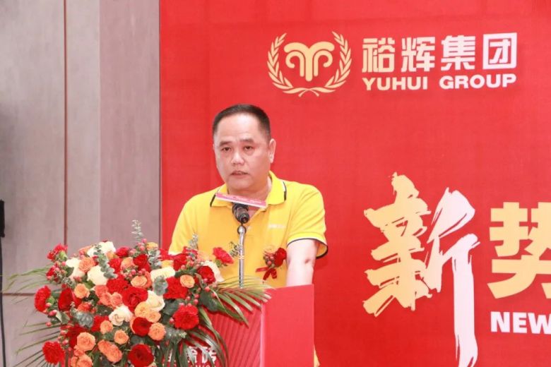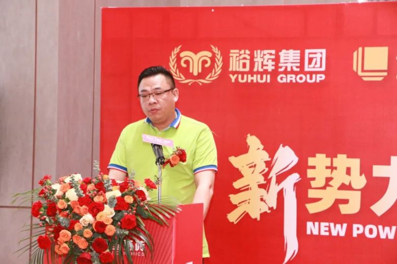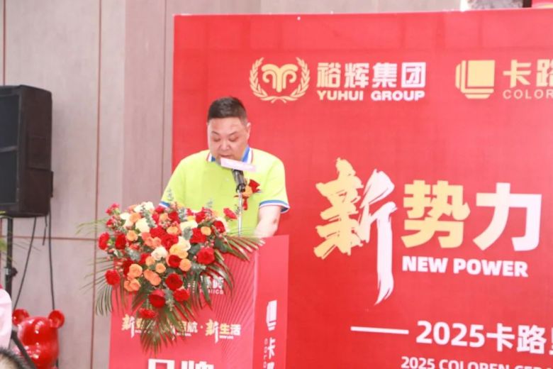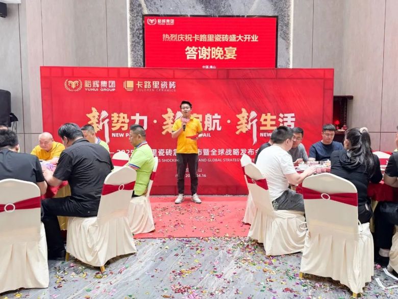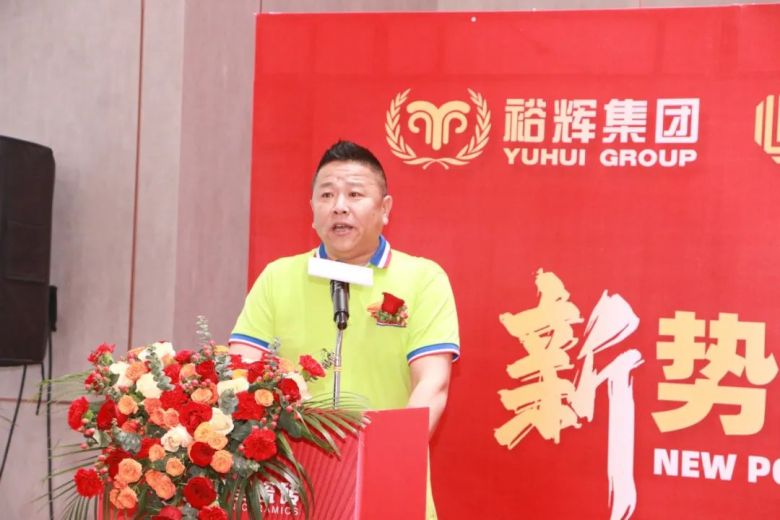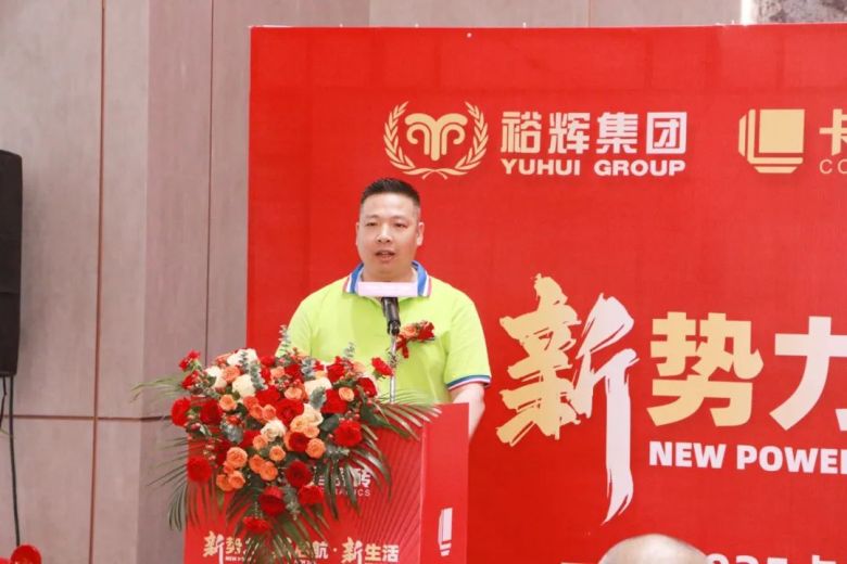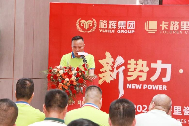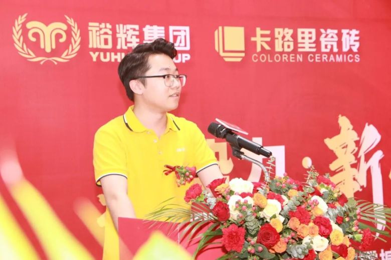 裕辉集团董事长助理罗伟照致辞,罗总首先向在场嘉宾朋友们致以衷心的感谢,在过去的历程发展中,裕辉集团一路斩获优秀的业绩离不开在座每一位的辛勤付出和紧密合作。罗总强调了新品牌卡路里瓷砖产品新工艺、生产实力和强化终端的重要性,卡路里人紧跟时代步伐,不断加大技术创新和高端产品的研发力度,为各位经销商伙伴赋能,提升竞争力和市场占有率,同时也为消费者提供高品质生活,让我们携手追梦,共创美好未来!