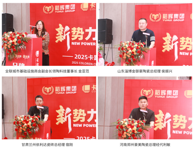 随后,由全联城市基础设施商会副会长/领陶料技董事长 金亚范、山东淄博金御豪陶瓷总经理侯振兴、甘肃兰州依利达瓷砖总经理宿刚、河南郑州豪美陶瓷总理经代利敏别为卡里路品牌发布盛典致辞,并祝愿卡路里瓷砖生意兴隆、财源广进,客似云来、货如轮转!