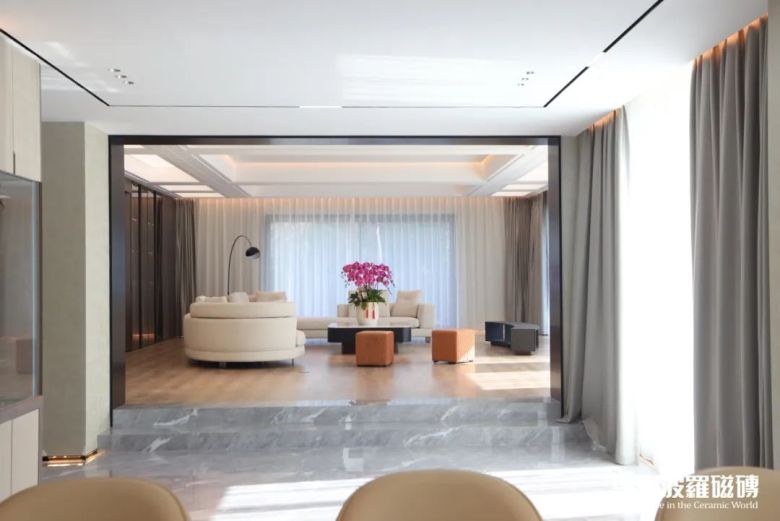 落地窗引入大片光线,为客厅镀上一层浅浅的金色。马可波罗岩板鱼肚蓝有着浩瀚大海般的深沉稳重,静谧而优美,纹理清晰流畅,整体美观素雅,能够契合多种不同的装饰方案。