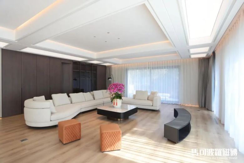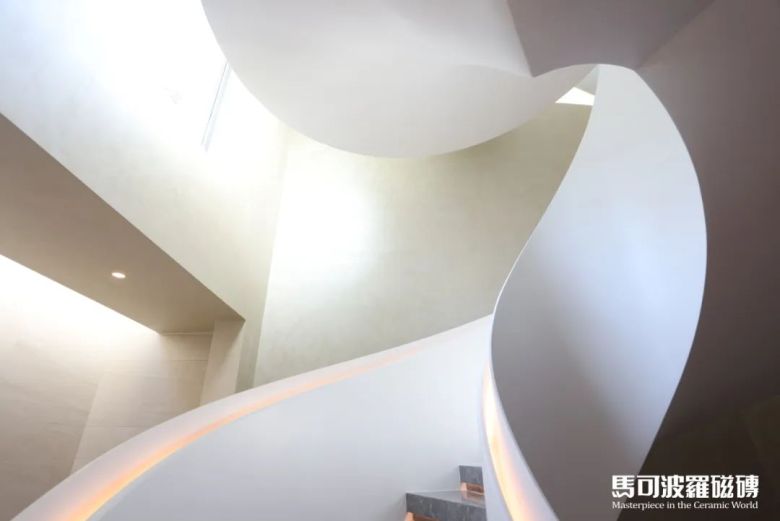 天井的设计是这个家中的一大亮点,选用低调细腻的马可波罗大板西班牙砂岩通铺墙地面,整个空间仿佛置于自然中,散发出纯粹质朴的优雅气息。蜿蜒盘旋的楼梯如同飘转而下的丝带,极富设计感和韵律美。