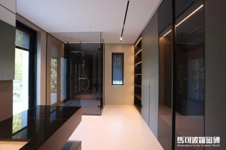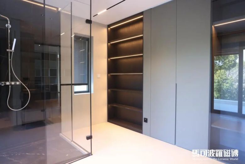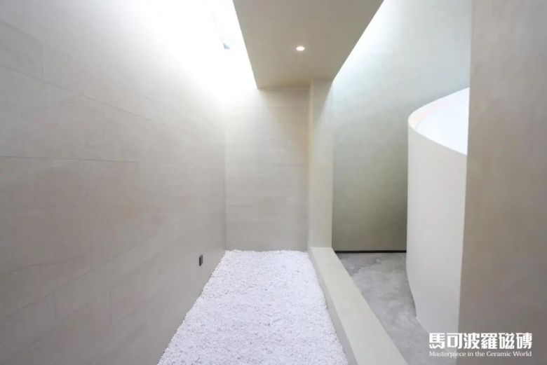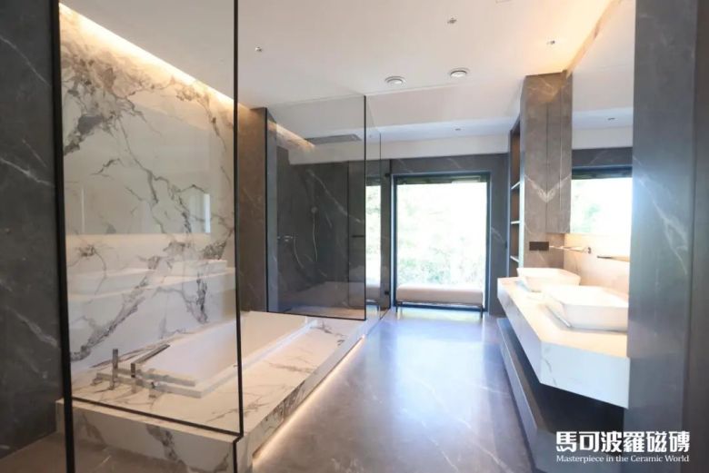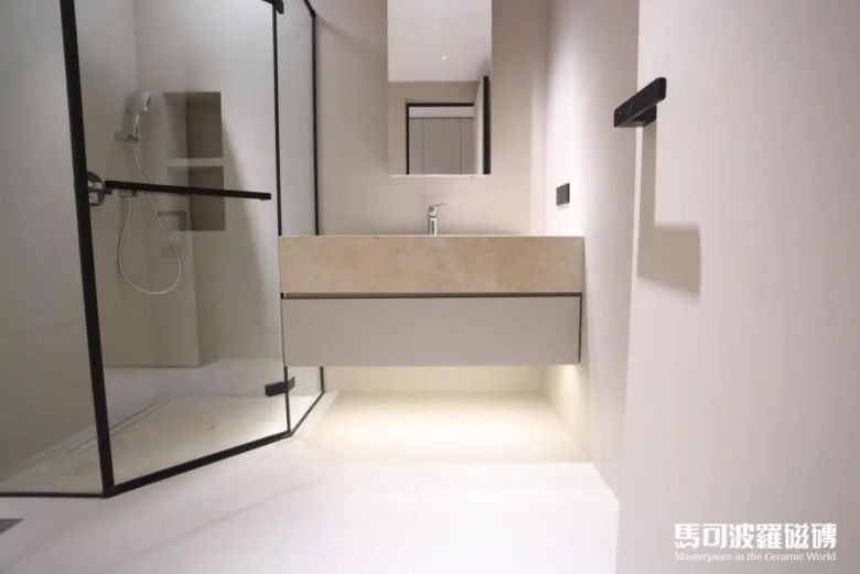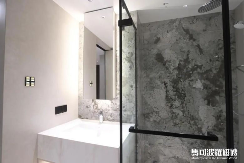 卫生间采用了马可波罗撒丁岛灰和马可波罗希腊白金的岩板组合,柔和细腻和苍劲大气在二者的搭配上表现得淋漓尽致,深浅对比的绵延纹理相映成趣,展现出一种自然和谐的艺术感,在保持空间简约调性的同时,渲染出天然的优雅气质。
