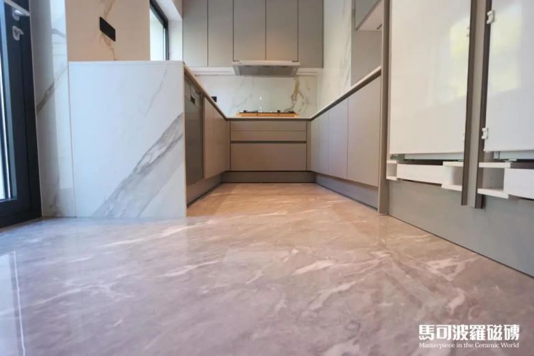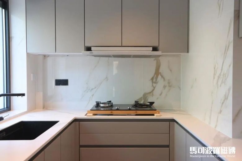 厨房墙面采用马可波罗大板鱼肚金,金色网状纹理,搭配纯净的白色底色,表现出简雅轻奢的现代风格,表面光滑易洁,日常烹饪打理更省心。