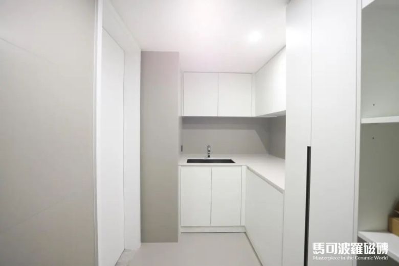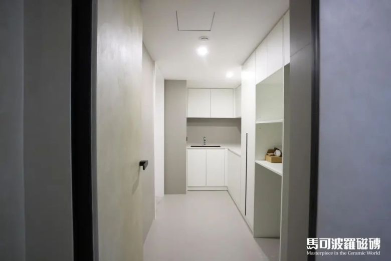 储物室大片应用了白色与低饱和度的高级灰,整个空间没有多余的装饰,块状分区干脆利落,突出了区域的功能性和实用性。