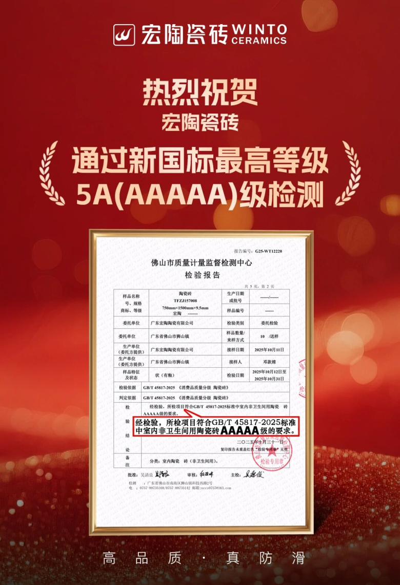 随着12月1日新国标正式实施,消费者购买瓷砖时认准5A标识,就能选购到媲美甚至超越国际标准的优质瓷砖。宏陶此次获得5A认证,是其“技术立企、标准立品”的全新开篇,也是中国陶瓷行业从制造向“质造”跨越的生动实践。