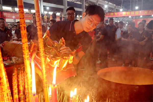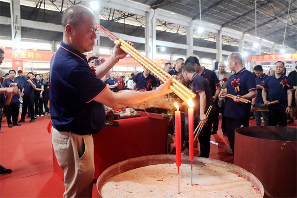 点火前,圣晖企业董事长廖年权携众员工一起进行拜神仪式,焚香祈福,祝愿圣晖企业新的一年红红火火、生意兴隆、财源广进!