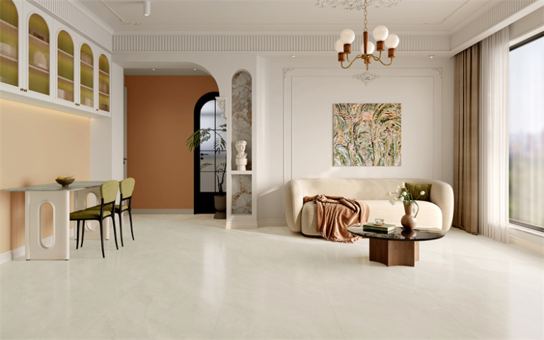 米白色弧形沙发如云朵般舒展开来,搭配棕色毛毯与绿色抱枕,勾勒出家的松弛感。地面通铺绒·石PRO系列浅色瓮砖,细腻的哑光质感映照目然光,让空间更显开阔明亮。圆形玻璃茶几上的花瓶与书籍,记录着二人赖在沙发上的闲适时光。